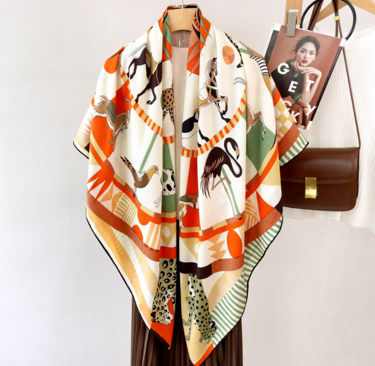 70% Cashmere 30% Silk Scarf Brown leopard Print Shawl Wrap Double Face135X135cm