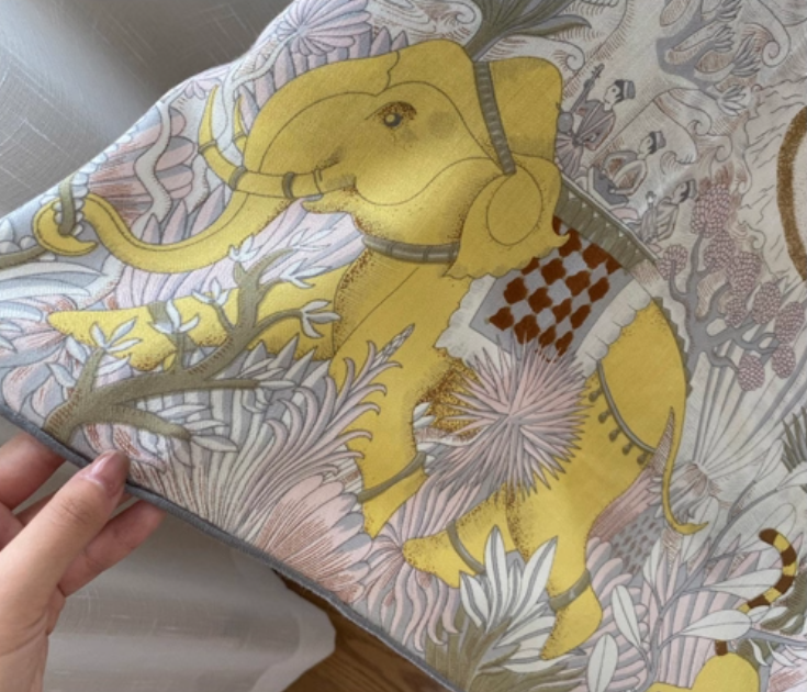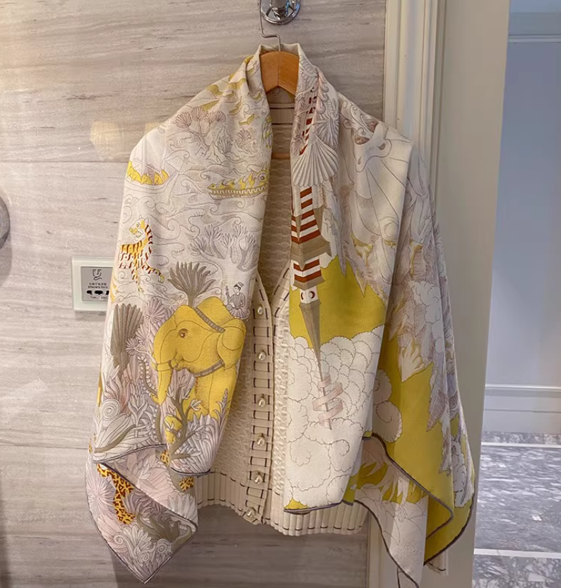 Scarf Care: Please do not wash the scarf, spot clean or cashmere professionals only. Item description: Size: 52 inches x 52 inches (132cm x 132cm) Material: 70% cashmere 30% silk Weight: 162g Print on one side of the scarf. Hand rolled on the 4 edges, so the size could be 1 inch difference. Made in China, no brand label.