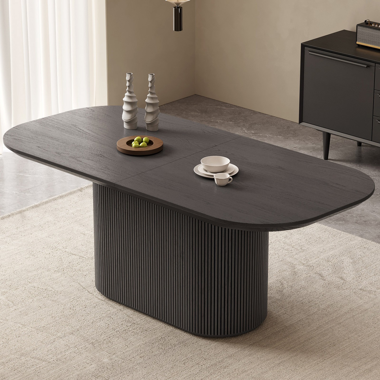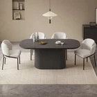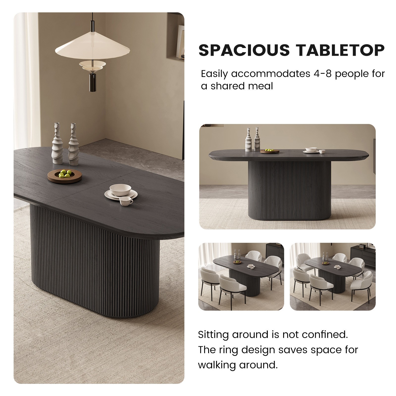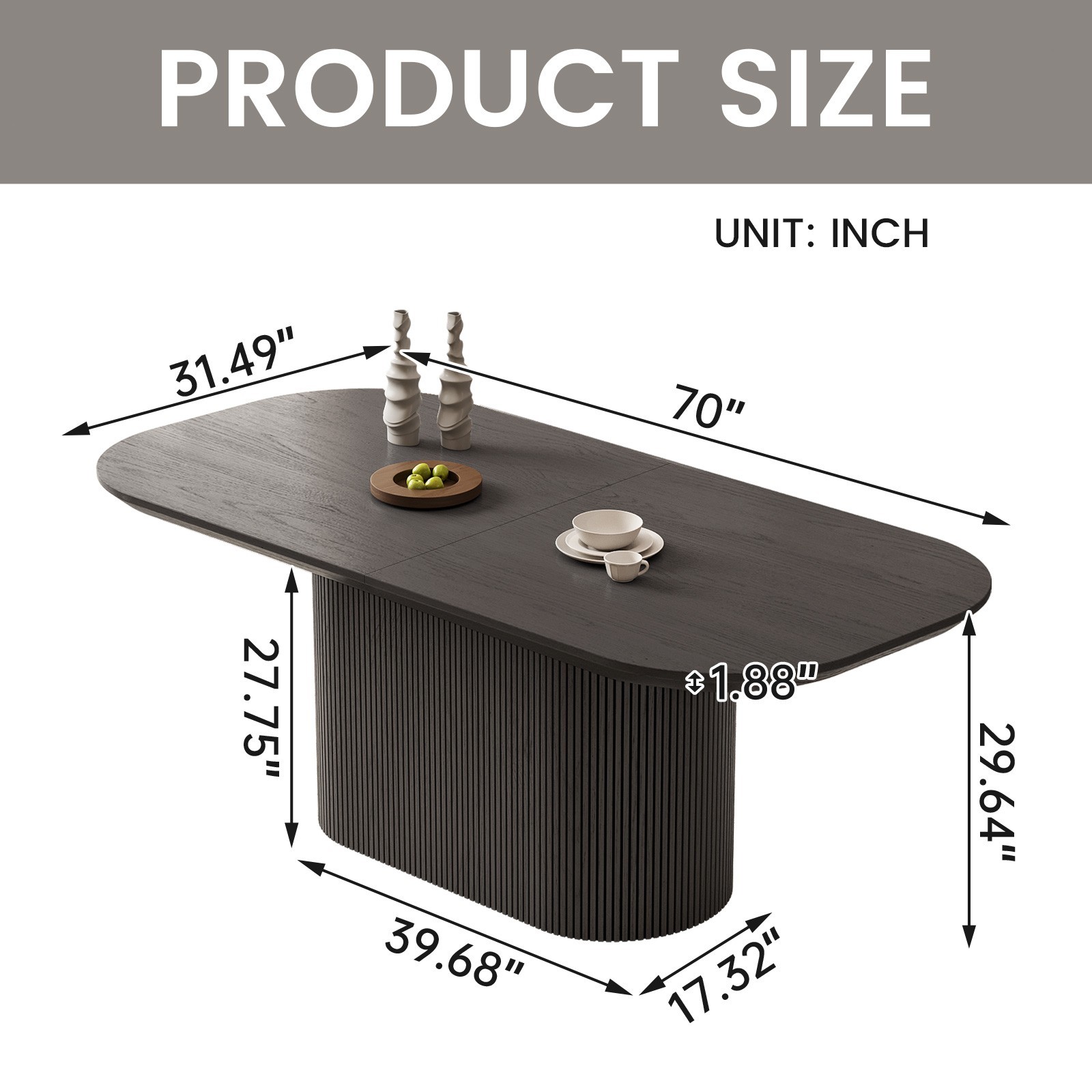 About this item Sturdy and Unique Oval Base : Our dark grey wood grain oval dining table features a robust and aesthetically pleasing design with its elongated oval-shaped legs, measuring 39.68 inches in length. These sturdy pillars not only provide a strong visual statement but also boast exceptional load-bearing capabilities, ensuring the table can comfortably support substantial weight without compromising stability Spacious and Thick Tabletop : Crafted from premium quality boards, this expansive tabletop offers a generous surface area for hosting large family dinners or social gatherings. Measuring 70 inches long and 31.49 inches wide, it provides ample room for multiple place settings. The tabletop thickness of 1.88 inches further adds to its durability and solid feel underhand Rounded Corners for Safety: Thoughtfully designed with rounded corners, this dark grey wood grain kitchen table prioritizes safety, especially in households with children or pets. This ergonomic touch helps prevent bumps and injuries, making it a family-friendly addition to your dining space Elegant Dimensions and Design: With dimensions of 70" L x 31.49" W x 29.64" H, the table is proportioned to seat a considerable number of guests while maintaining an elegant presence in any dining room. Its sleek, dark grey wood grain finish complements a variety of decor styles, from minimalist to classic, and allows the table to serve as the centerpiece of your dining area Easy Assembly and Maintenance : This dining table has been expertly engineered for effortless assembly, allowing you to set it up quickly and efficiently. Moreover, the smooth surface and high-quality materials make cleaning a breeze, ensuring that the pristine beauty of the dark grey wood grain finish remains intact with minimal upkeep over time 100% Customer Guarantee : Guyii provides you with quality products and excellent customer service. If you encounter any problems with the dining table, please do not hesitate to contact us, we will provide you with fast and friendly customer service. Get yours and more for family and friends TODAY