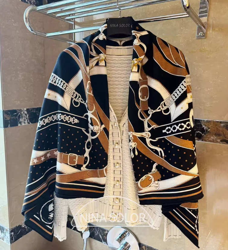 $ 52.8100% Cashmere Wrap Shawl Square Blue Horsebit Print Bandanna Scarf 130X130cm NEW