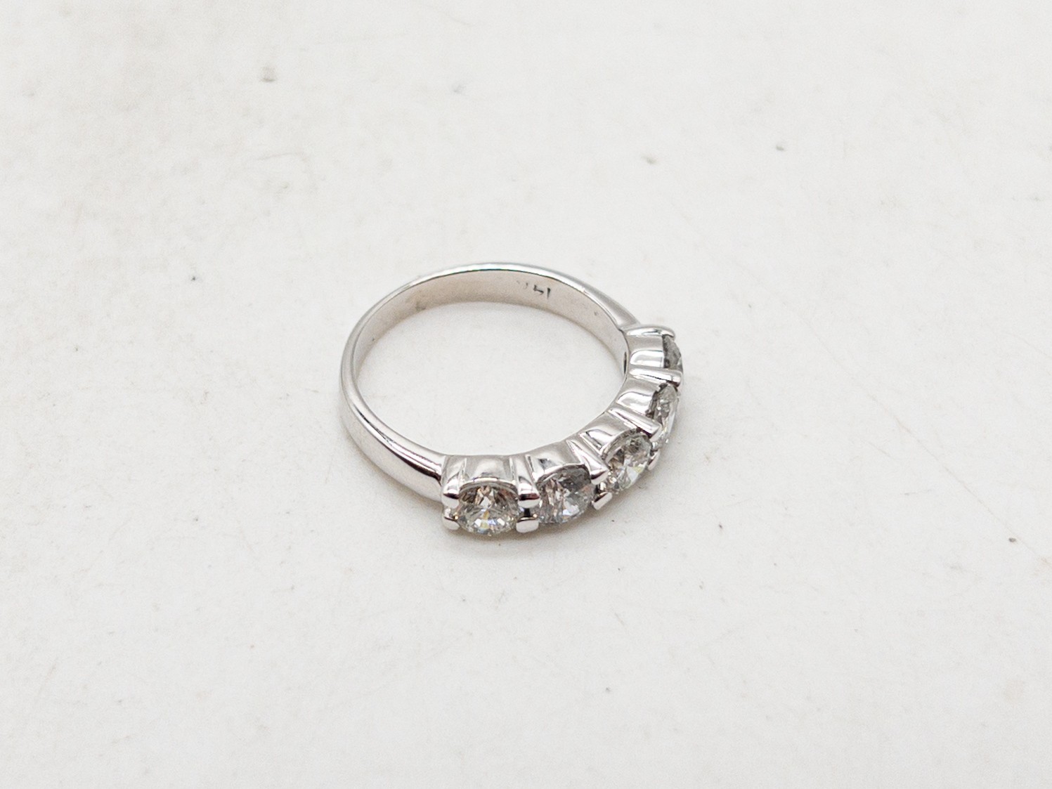 Description: Large wedding band ring in solid 14k White Gold. 1.50cts in 5 .30ct VS H Natural Diamonds. NICE wedding band ring and GORGEOUS estate piece in solid 14k White Gold. Stone: Natural Diamonds Metal: 14k White Gold Ring Size: 6 Gram Weight: 3.6 Powered by SixBit's eCommerce Solution