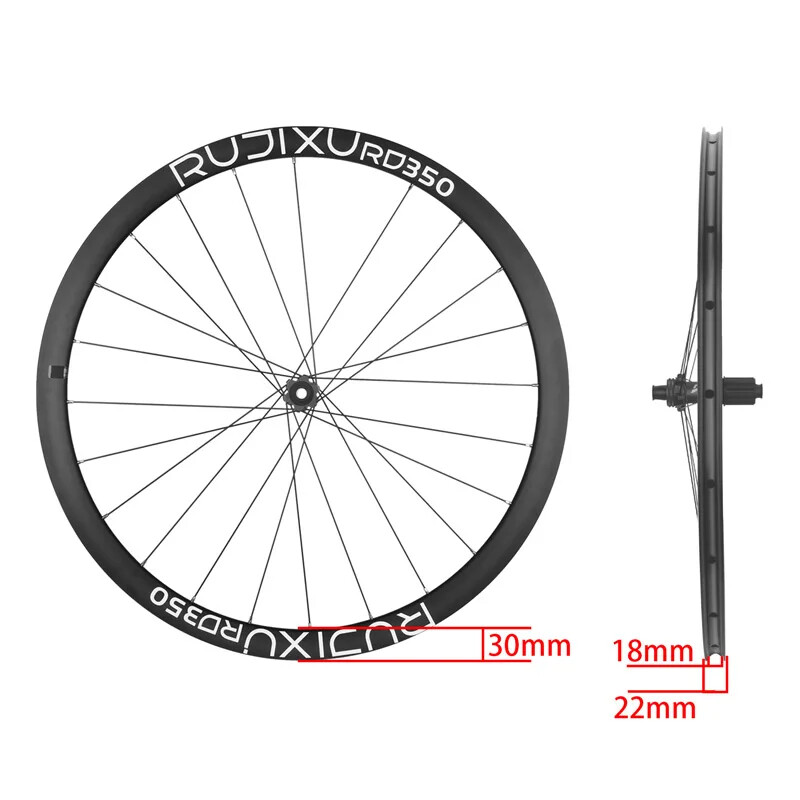 Model: RD350-T Material: ultra-light aluminum alloy Rim: Outer width 22mm inner width 18mm frame height 30mm Spoke: Taiwan Xin great circle spoke Bearings: sealed bearings Flower Drum: RUJIXU lock flower drum Ratchet: 36T 54T planetary teeth Taki: HG,XDR can choose Weight: 30mm 1630G 35mm 1680G 38mm 1950G 41mm 2000G (weight does not include tire pads and quick removal) Outer tire: compatible with open inner and outer tires, can be modified vacuum tires. Specifications: Quick-release version 100*9 135*9mm Barrel shaft version: 100*12 142*12mm Wheel size: 700C (622MM) Tire size: Compatible with 23 25 28 32 35 38 42 45 C Number of spokes: 24 holes in front wheel, 24 holes in rear wheel Warranty: Two years warranty, man-made damage is not guaranteed Accessories: barrel shaft version (with 1 gasket, 2 extended air nozzle, 2 spare spokes) Quick release version (with 1 gasket, 2 extended air nozzle, 2 spare spokes, front and back quick release pair)