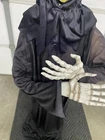 This Gemmy 70" tall grim reaper is sound and motion activated, his eyes light up and he moans and groans. He has posable arms and is collapses down for easy storage. He requires 3 AA batteries that are not included. He has a yellowed face and one side of his robe has faded all from sun exposure but he works great. You get the actual item pictured so please look at all photos and ask any questions before purchase.