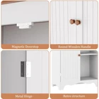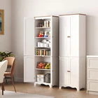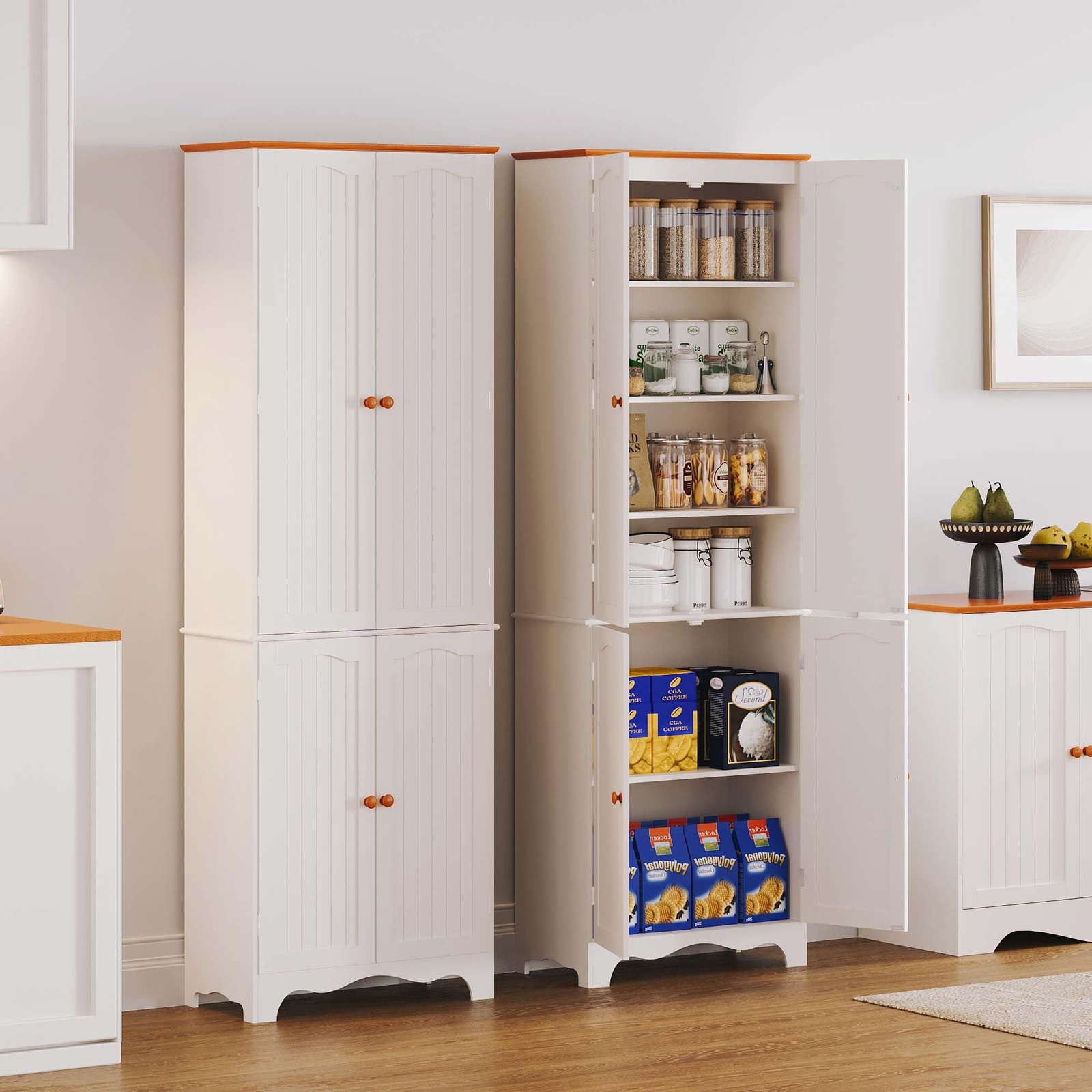 Description:This eye-catching tall pantry cabinet provides ample storage for all of your kitchen necessities and more.It is a wise addition to your home. It coordinates with a charming collection for a complete look.Functionality and style working in perfect harmony.Whether it is for bathroom,kitchen or living room storage,this practical cabinet will all fit. Product Parameters: - Color: White - Dimensions: 24.02"Wx12"Dx72.05"H - Material: painted MDF and wood composite - Assembly: Required - Net weight: 55.88lb (25.4kg) - Gross weight: 59.18lb (26.9kg) Shipping List: - 1 xKitchen Pantry - 1 x Instructions Note: - Please contact us if you have any problem with the kitchen buffet or assembly. 【Versatile Tall Cabinet】The elegent tall cabinet with ample storage space can be placed in kitchen, living room, bathroom, or hallway. Without too much elaborate ornamentation, it will become the optimal choice of contemporary furniture. 【Adjustable Shelf】This kitchen pantry totally has 5 shelves, and the top 2 shelves in up cabinet can be adjusted up and down by 2.5inch, they also can be detached separately to provide more flexible storage space for different sized items. 【Sturdy and Safety】Our tall cabinet is constructed from durable MDF board, which is heatproof, scratch proof, waterproof, sturdy for long time using. Comes with anti-tip devices for added stability, creating a safe environment for your family. 【Upgrade Your Storage】The pantry cabinet measures 72.05'' H x 24.02'' W x 12'' D, it features 6-tier shelving unit for storing utensils, cookbooks, dry goods, tea, coffee or seasonings. The 4 doors keep your items stay safe and dust-free. 【Modern Stylish Design】This cabinet features a streamlined silhouette, white painted wood finish with honey brown top and knobs, designed to blend into a variety of decor styles and color schemes, also meet your aesthetic needs.