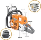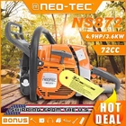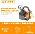 NS872 72cc Chainsaw with 20'' Guide Bar and Chain. The power head and bar combo are two separate parcels. 1PC Chainsaw Power Head 72 CC 1PC Guide Bar Cover/Gloves 1PC Handle Tank Guard Protection Plate 1PC Tool Kit/Fuel Oil Mixing Bottle 1PC Instruction Manual 1PC Glasses/Earmuff PRO Commercial 72cc Gas Chain Saw NEO-TEC NS872 Gas Chain Saw Power Head Fit for MS381 All Parts are compatible with MS381 72cc Working Power 3.6 KW Ideal for Big Wood Cut with Handle Bar NS872 chain saw fit for 25/28 inch guide bar which cuts through the woods or falling tree quickly and easier. Fit for 3/8 Bar and Chain Item weight: 7 kg Power: 3.6 kw Equipped with 3/8 rim sprocket Fit for Up to 28 inch bar and chain Gravity Casting Cylinder Block Chrome-Plated cylinder HLHIC Carburetor Taiwan crankshaft Torch spark Supper power Ignition Coil Magnesium crankcase,starter,sprocket Engine Oil Selection Gaslione ration: FD 35:1 Fuel tank: 680 ml Engine oil tank: 360 ml