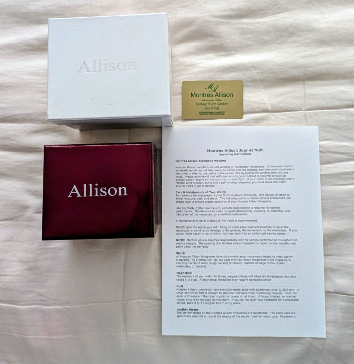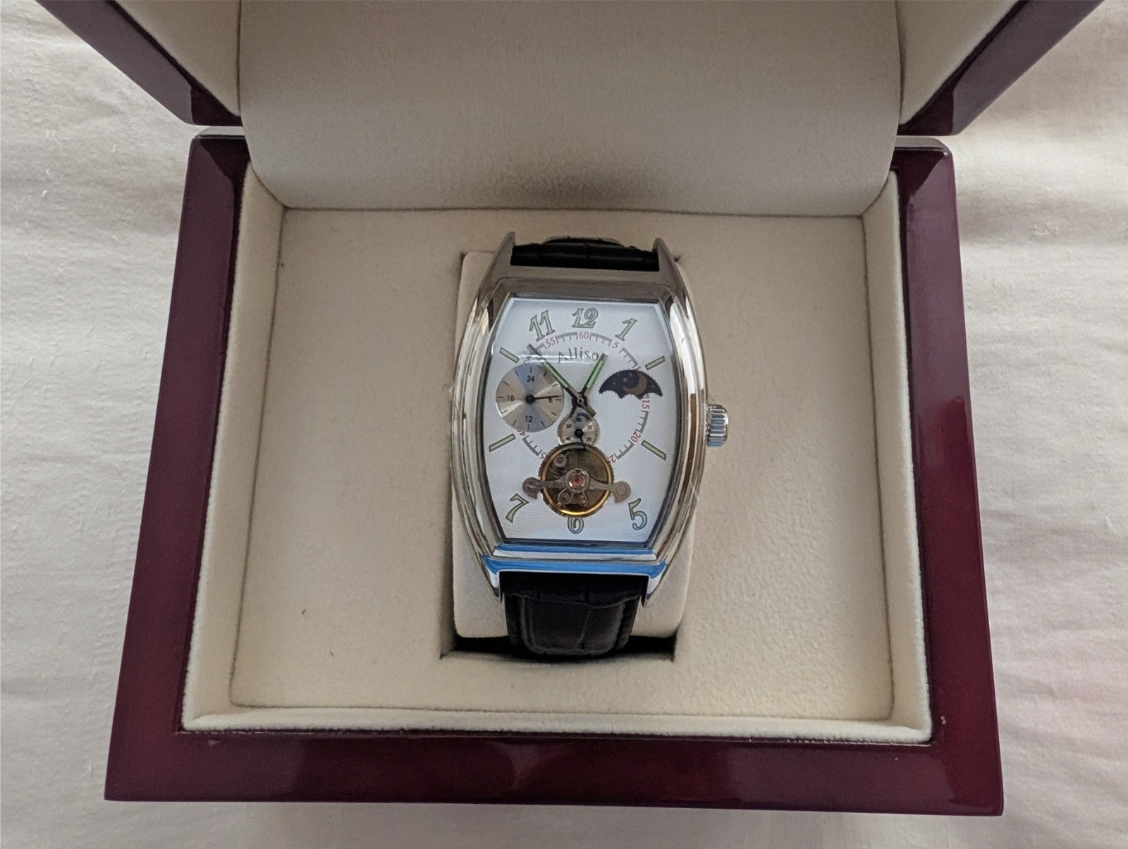 New Montres Allison Jour et Nuit 2006 special anniversary edition, number 16 out of 200, features, wooden box, warranty card, Instructions, watch lugs 20 mm face white, numbers and hands, super lumi nova coating, moon phase, second hand dial, fly wheel, 316 stainless steel case, genuine crocodile leather strap, stainless steel deployment, ma screw down crown, sapphire crystal, in house Montres Allison mechanical movement, Retail 7500.00