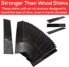 Store New Arrivals Add to Favorite View Feedback Contact Never-Rot 7.75 Inch Composite Shims, 12 Pk. Home Improvement DIY Levelers, Extreme Weight Capacity, Weather Resistant, Easy to Break & Perfect for Doors, Windows, & Sheds. Description Item model number Never Rot Composite Shim Part Number Never Rot Composite Shim Batteries Required? No Number of Items 12 Item Package Quantity 12 Color Black Grade Rating Commercial Material Plastic Item Weight 9.1 ounces Shape Rectangular Batteries Included? No Measurement System Inch Item Thickness 0.26 Inches Item Form Sheet Package Dimensions 7.91 x 2.56 x 1.57 inches SUPER STRONG & DURABLE COMPOSITE SHIMS: Our plastic wedge shims, made from 100% high-quality recycled materials, boast 30% more load support and pressure capacity than wooden shims. These stackable shims are perfect for all your leveling, repairs, and home improvement projects, ensuring superior durability and strength. INDOOR/OUTDOOR MULTI-USE WEDGES: Our 7.75-inch composite shims cater to a variety of indoor and outdoor projects. Use these Heavy Duty Shims for leveling, plumbing, appliances, cabinets, countertops, doors, windows, furniture, decks, spas, fountains, gazebos, and mailboxes, providing unmatched versatility. LIFETIME MONEY-BACK, NO NONSENSE GUARANTEE: ensuring 100% satisfaction for all your leveling needs. We stand behind our durable, high-quality shims, and if you're not completely satisfied, we promise to make it right. Trust our weather-proof, never-rot shims for a lifetime of reliable use, backed by our unwavering commitment to your satisfaction. NEVER-ROT & WEATHER PROOF SHIMS: Our Never Rot shim levelers are waterproof and decay-resistant. Unlike wooden shims, these plastic shims won't rot, warp, swell, crack, or split, enduring rain, snow, and other harsh outdoor conditions. Trust our composite shims for a lifetime of reliability. EASY & CLEAN BREAKS: Our 7.75" plastic wedges are 4 times easier to snap than wood, with pre-scored lines ensuring clean breaks. No need for additional cutting or trimming—simply measure and snap. Save time and energy with our user-friendly design, requiring no additional tools. Introducing the ultimate solution for all your leveling needs - our heavy-duty, weather-resistant, and easy-to-use composite shims. Proudly made in the USA and crafted from 100% recycled materials, these shims are perfect for both indoor and outdoor applications. Say goodbye to rotting wooden shims and hello to the perfect home improvement companion that can handle even the toughest of jobs. Extreme Weight Capacity Our composite shims are designed to hold an impressive 16,000 pounds of pressure, making them ideal for heavy-duty applications such as doors, windows, and sheds. With their extreme weight capacity, you can trust these shims to provide reliable support and stability to your projects. Weather and Insect Resistance Can these be covered in dirt and left outside? Great question, and yes they can! These shims will not rot and are designed to stand the test of time even in harsh climates. Made from durable composite material, they won't rot, swell, or warp even when exposed to harsh outdoor conditions. These composite shims are much more durable than wood shims, ensuring lasting support for your projects. Easy-to-Break Pre-Scored Lines What's in your order? Each order comes with twelve (12) composite shims, each 7.75 inches long with easy snap pre-scored lines. There's no need for additional cutting or trimming, as these shims easily snap to the desired size, saving you time and effort during your DIY projects. Satisfaction Assured for Life! We believe in the quality and performance of our composite shims so much that we assure your satisfaction for life. If you aren’t completely satisfied with your order, simply email us, and we will respond within 24 hours to make it right even on the weekends. We absolutely assure your satisfaction! ABOUT US We offer the best prices around on high quality products. Our E-store includes media such as books, movies, music and games while offering electronics, toys, sporting apparel, clothing, tools, general home, garden items and more. SHIPPING We are always working hard to ensure your package arrives as soon as possible. Please understand that some factors like weather, high postal traffic, and the performance of shipping companies are outside of our control. We offer free shipping to the lower 48 states and ship within 2 business days of payment, usually sooner. We do not accept P.O. Boxes. Please provide a physical address. RETURNS We offer a 30-Day Return Policy on items which you are not completely satisfied with. You have the option for a full-refund or an exchange of the item. No returns are available on items shipped outside of the USA. PAYMENT We accept PayPal. CONTACT US This page content is yet to come Please ad us to your favorite seller and visit again later Thank You CUSTOMER SATISFACTION We try our very best to make sure every customer is completely satisfied. If there's a problem, message us! We're happy to help
