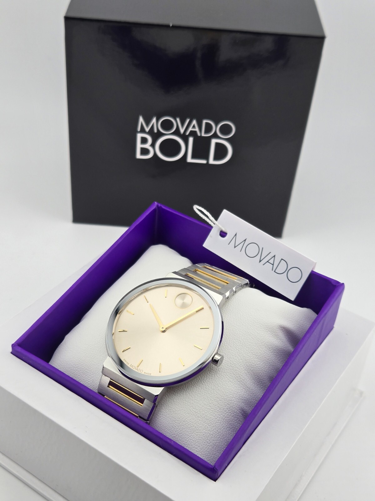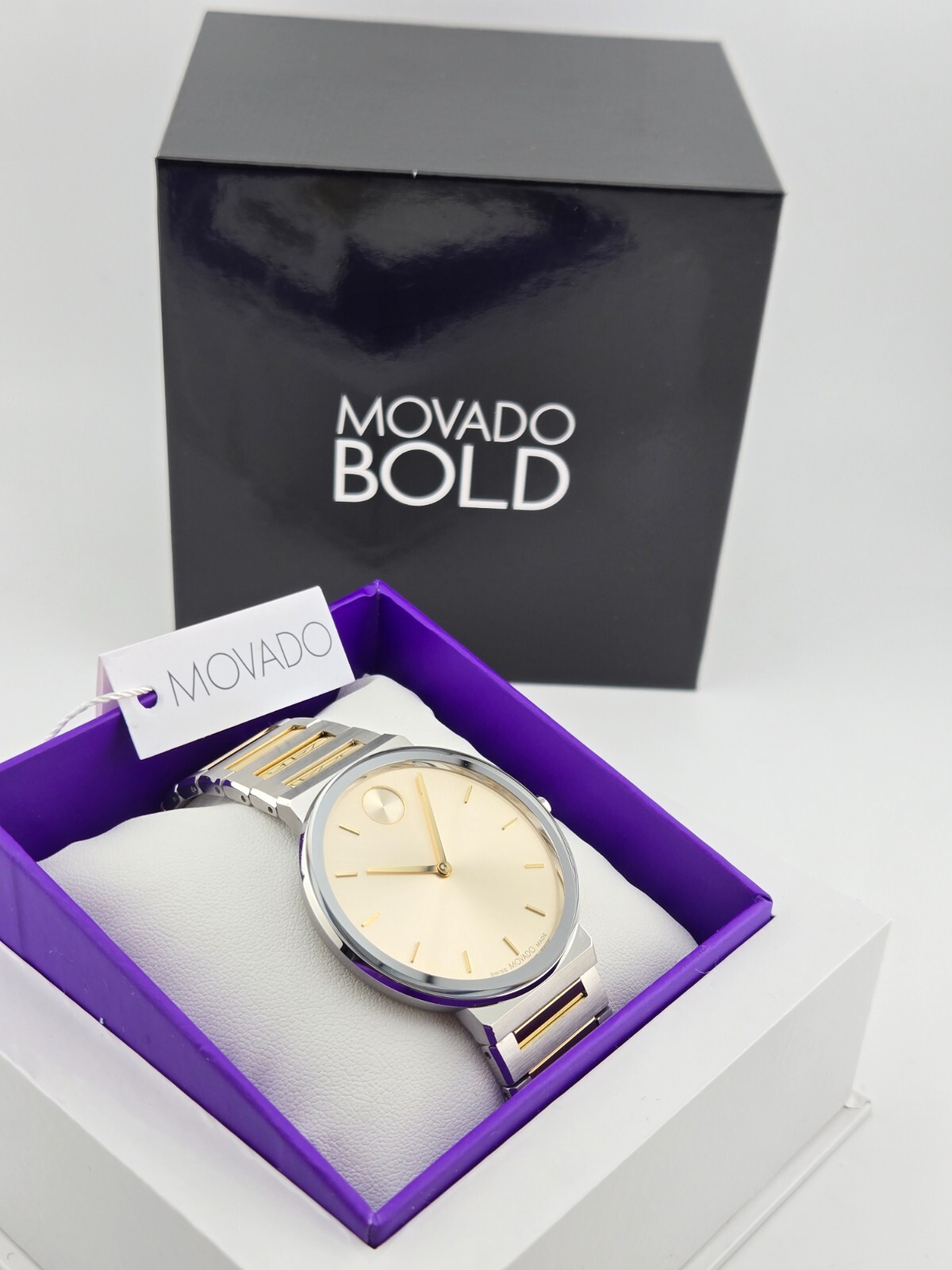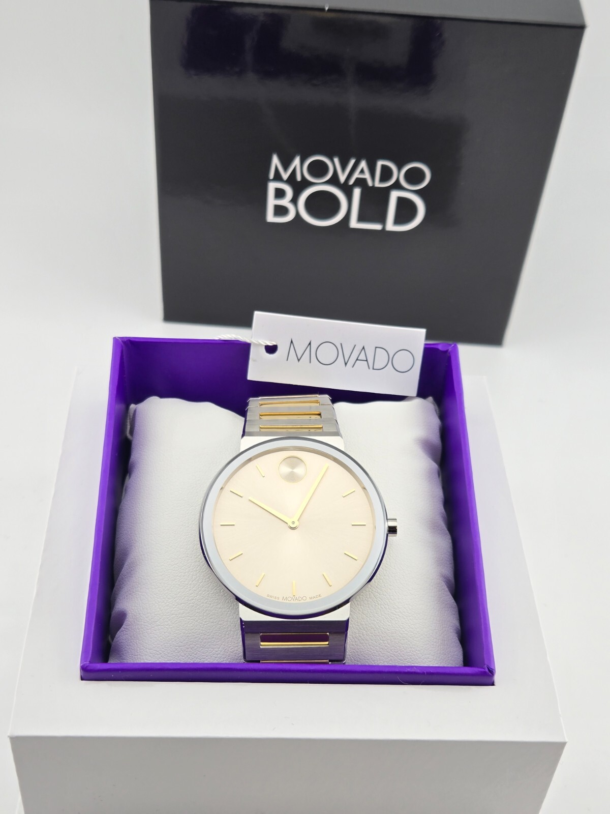 $795 MSRP | Movado Bold Horizon Taupe Dial Two Tone Men's Watch - 3601075 The Movado Bold Horizon Taupe Dial Two-Tone Men's Watch (Model 3601075) is a sophisticated timepiece that seamlessly combines elegance and modern design. Featuring a silver-tone stainless steel case paired with a two-tone stainless steel bracelet—blending silver-tone and yellow gold-tone accents—this watch offers a refined, stylish look suitable for any occasion. The fixed silver-tone stainless steel bezel adds a touch of durability, while the 40mm round case provides a balanced fit that is both comfortable and eye-catching. At the heart of this timepiece is the taupe dial, which is complemented by gold-tone hands and index hour markers for a striking contrast that enhances readability. The signature Movado dot at the 12 o’clock position adds a unique touch to the dial, a hallmark of the brand's iconic design. Powered by a precise quartz movement, this watch offers reliable timekeeping with hour and minute functions. The scratch-resistant K1 crystal ensures the dial remains clear and protected, while the pull/push crown allows for easy time adjustments. Designed for everyday wear, the Movado Bold Horizon is water-resistant up to 30 meters (100 feet), offering protection against water splashes and brief immersion. The solid case back enhances the watch's durability, and the deployment clasp ensures a secure and comfortable fit. Whether you're attending a business meeting or enjoying a casual outing, the Movado Bold Horizon Taupe Dial Two-Tone Watch adds a touch of luxury and practicality to your look. Features Silver-tone stainless steel case with a two-tone (silver-tone and yellow gold-tone) stainless steel bracelet. Fixed silver-tone stainless steel bezel. Taupe dial with gold-tone hands and index hour markers. Movado dot appears at the 12 o'clock position. Dial Type: Analog. Quartz movement. Scratch resistant K1 crystal. Pull / push crown. Solid case back. Round case shape, case size: 40 mm. Deployment clasp. Water resistant at 30 meters / 100 feet. Functions: hour, minute. Fast and Free Shipping You're already purchasing the item. Why pay additional for shipping, especially slow shipping? We get your order shipped out within 1-business day and delivered to your doorstep as quickly as possible. Competitive Pricing With our dynamic pricing model, our prices are always competitive. Our prices are some of the lowest that you will find on the internet. Rest assured that you're getting a good deal when purchasing with us. 30-day Money Back Guarantee We are committed to making sure that you leave this transaction satisfied. If you're unhappy with the product for any reason, you may return it back for your money-back or a replacement within 30 days. No questions asked!