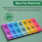Weekly Pill Organizer(Twice a day) Big size multifunctional medicine holder Meet your all needs √ Rainbow color compartment √ Sealed and Moisture-proof √ Easy to open √ High Capacity √ Meet the needs of one week √ Snap-in Design Safe and Food-Grade Material PP It is plastic that can be directly contacted with food. It has been certified by SGS and can be used safely. UV Printing increase product brightness and not easy to scratch. Product weight: 176 Grams Product Size: 9.49 x 4.69 x 1.1 inches One compartment size: 2.13 x 1.26 x 0.98 inches One compartment can be contained: 30 pills or 10 fish oils or 20 capsules