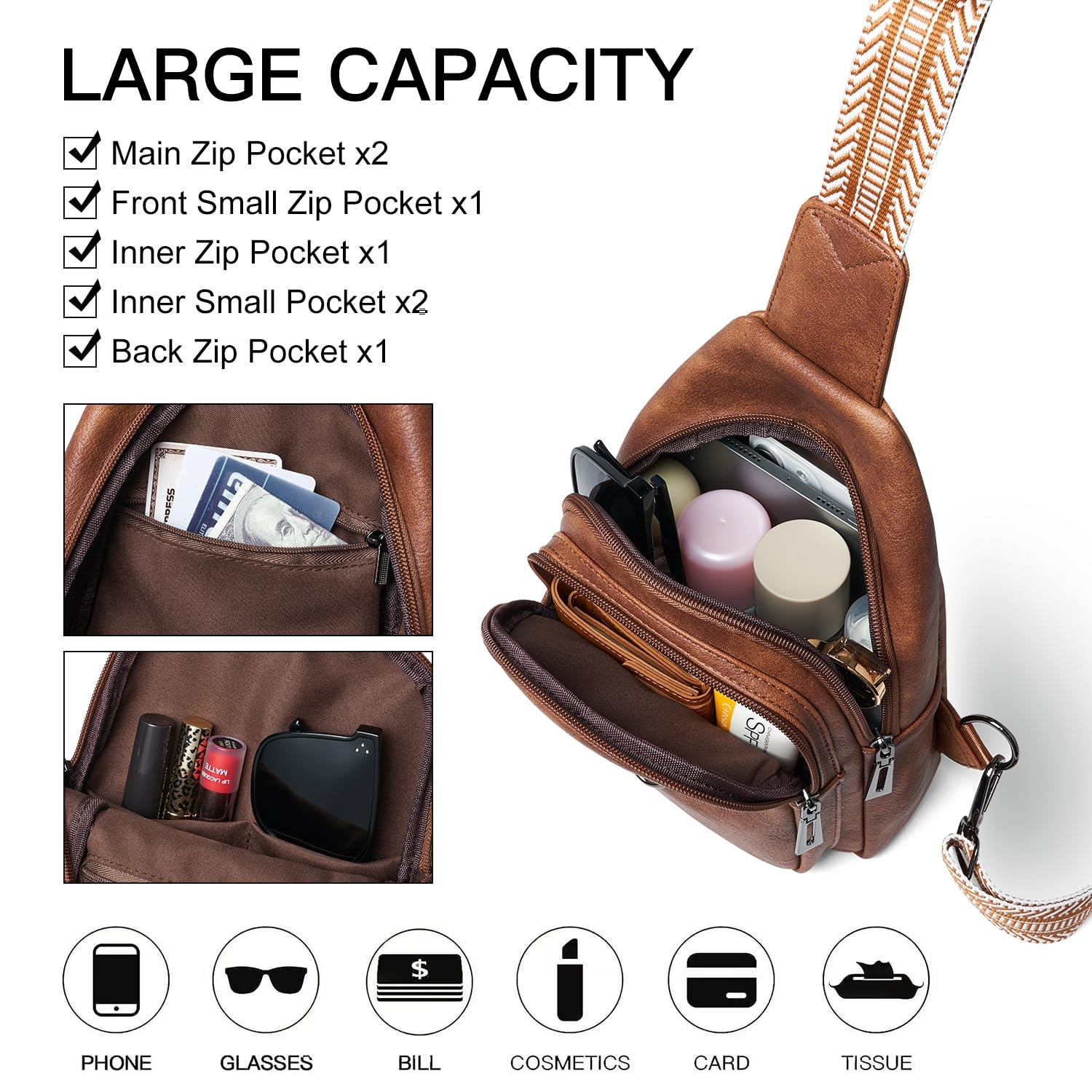 VERSATILE: If you go out without a lot of large things, it’s a good choice for keeping your hands free. This fanny packs for women cross body is a great companion for your travel diaries from dating and shopping to other outdoor activities like walking, running, hiking, biking, etc. Also, the cross body bag for woman is also a great idea as a special gift/present for birthday, Valentine's Day, Mother's Day, Halloween, Thanksgiving, Christmas, etc. 【UPGRADED- WOMENS SLING BAG】This more practical & stylish sling bag for women is made of water-resistant vegan leather. Smooth fabric interior lining to avoid scratching your inside item, customized metal hardware to make the small crossbody bag more advanced. 【MULTI-FUNCTIONAL STRUCTURES】Crossbody fanny packs for women features 4 pockets. Quick access small front zippered pocket for credit cards, cash and coins; two main zippered pockets for iPad mini, power cord, wallet, etc., and a hidden rear zippered pocket for your phone or important documents. 【DECORATIVE D-HOOKS】Our travel purse is designed with a D-shaped hook to hang your favorite accessories to decorate your bag. An earphone hole on the back pocket enables you to enjoy music easily, and when your phone is out of battery, this small hole can also help you connect to the power source inside the bag. 【MULTI CROSS WAY】Flexible satchel shoulder strap varied from 24 to maximum 51 inch can be adjusted loose or tight. Two ways of carrying: left or right. You can use it as a sling backpack, crossbody bag, chest bag and shoulder bags. 【VERSATILE】The D-ring at the bottom allow you to comfortably wear and quickly remove the fanny packs for women cross body when passing the security inspection. Perfect for work, vacation, sport and any outdoor activities. It's also the perfect gift for women.