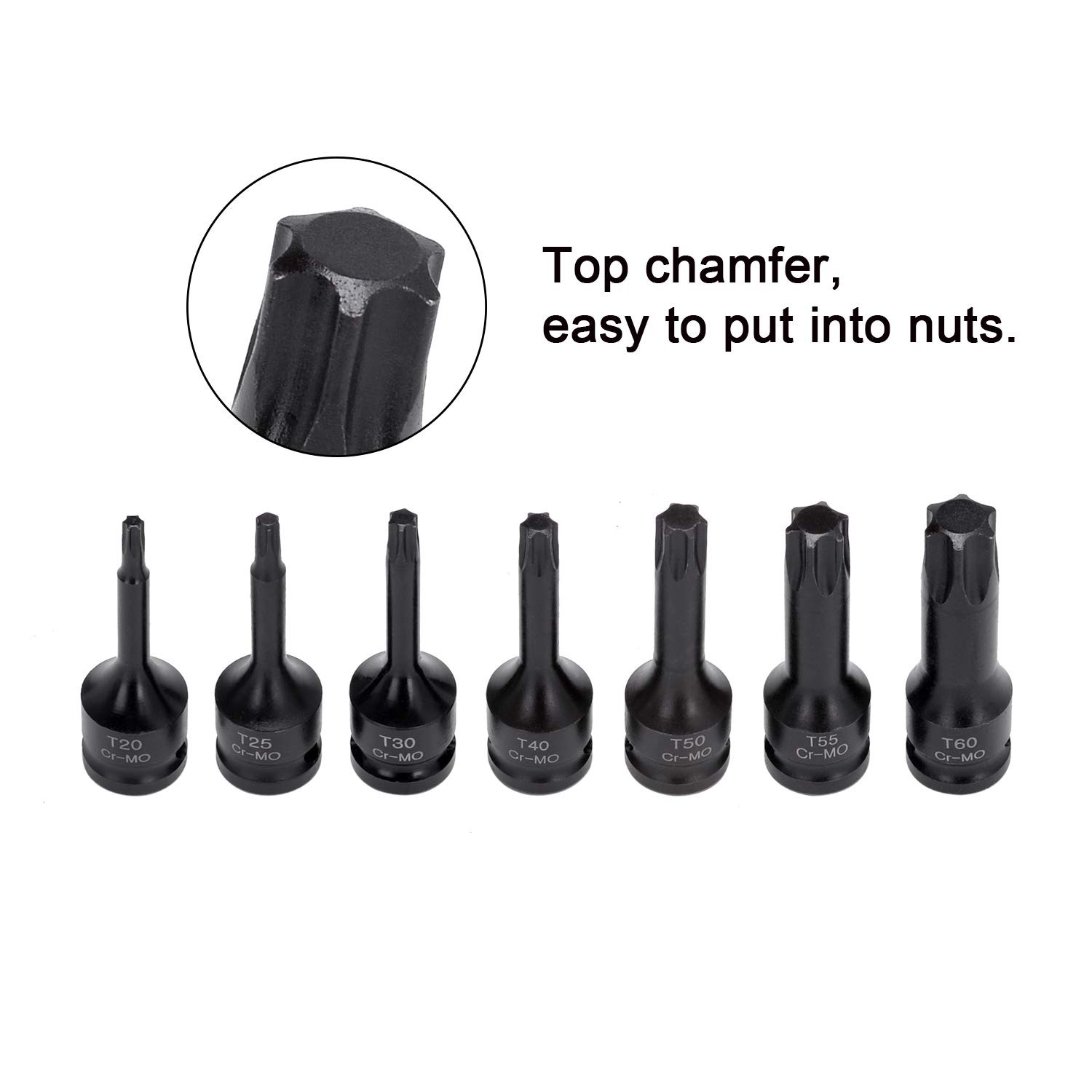 3/8” Drive Torx Star Driver Bit Socket Set, T20-T60 7 Piece Cr-Mo One-Piece Construction Impact Socket 1. Quality : You Can Trust Heavy Duty Construction Constructed from durable and heavy duty Chrome Moly steel for extra durability that can withstand and retain the quality after multiple uses. 2. Black Phosphate Coating Protection : Each socket is coated with a black phosphate outer layer for extra protection against corrosion and rust so your tools stay in pristine condition. 3. Pin Hole Design : Sockets are designed to use with pin hole and o ring systems and aids in socket retention for a secure hold. 4. Easy Storage and Organization : Each set comes with a sturdy blow molded case for easy organization and safekeeping. Simply tuck it away when not in use. 5. Laser Etched Sizes : Easily identify which sized socket is needed with the high contrasted laser etched engraving on each socket. 6. Size : T20, T25, T30, T40, T50, T55 and T60. PRO QUALITY: Set of 7 piece 3/8” drive, 6cm long chrome moly steel impact star sockets designed to withstand the high torque of impact wrenches. BLACK PHOSPHATE COATING PROTECTION: Each socket is coated with a black phosphate outer layer for extra protection against corrosion and rust so your tools stay in pristine condition. FULL SIZE: Includes T20, T25, T30, T40, T50, T55 and T60 with a plastic box. 3/8" drive torque bits with precision milling for exact fit HEAVY DUTY CONSTRUCTION: Made of dropped-forged Chrome Moly steel for maximum strength and durability. 3/8" drive sockets are impact ready and offer high strength and torque. LIFETIME WARRANTY: Why lots of people choose . From our high-grade products to our focus on customer service. No matter what problems you have, just contact us and our professional after-sale team will get in touch with you and timely solve your problems.