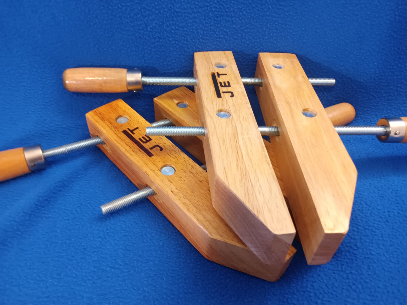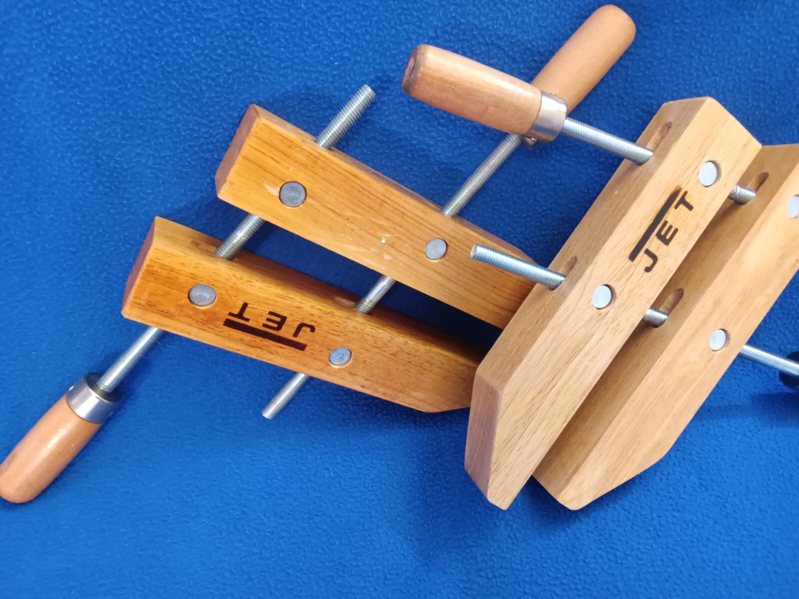 Offered is a set of 7 JET adjustable 10" wood clamps in excellent used condition. The opening when fully extended is 5" by 6".
