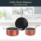 Nonstick Ceramic Cookware Set, Copper Pots and Pans Set 【All in One Little Set】offers high quality kitchen pots and pans set without assembly: 8" non stick frying pans, 2 piece saucepan set including 1.5 quart sauce pan with lid and 3 quart casserole pot with lid, 2 nylon kitchen utensils set (Turner+Spoon). Versatile non stick pot and pan set meets all your need for every day cooking. Perfect ceramic pots set for compact kitchen 【Nonstick Ceramic Cookware】induction pots and pans feature long-lasting ceramic nonstick coating, makes cooking more enjoyable and easier. EUROFIN approved, 100% free of PFAS/PTFE/ PFOA/lead/cadmium. Clean up is quick & easy, simply rinse or wipe with a damp paper towel. Enjoy healthier and easier cooking with ceramic pots and pans set non stick 【Premium Cooking Pan Set】induction cookware sets is aesthetically made for everyday cooking. Rustic copper color and nonstick ceramic interior is attractive yet functional. Food just glides off the surface, requiring minimal oil for healthier cooking. Pot set comes with elegant gift box, best choice as cookware starter set for family use and house-warming gifts 【Stovetop & Oven Safe】This nonstick cookware set is crafted from heavy-duty aluminum, heats up quickly and evenly. Low or medium heat is recommended. High magnetic conductive steel base is compatible with all cooktops including induction, gas, electric, ceramic and so on. Our non toxic cookware set is oven and broiler safe up to 550°F, providing you with more choice for cooking and baking 【Stainless Steel Handles】This copper pots and pans set is equipped with ergonomic stainless steel handles, featuring non-slip and easy-to-grip. Suggest to hold with a glove when heating on gas stove. Durable glass lids with steam vent for a clear view on food while cooking, lock the best taste of the food