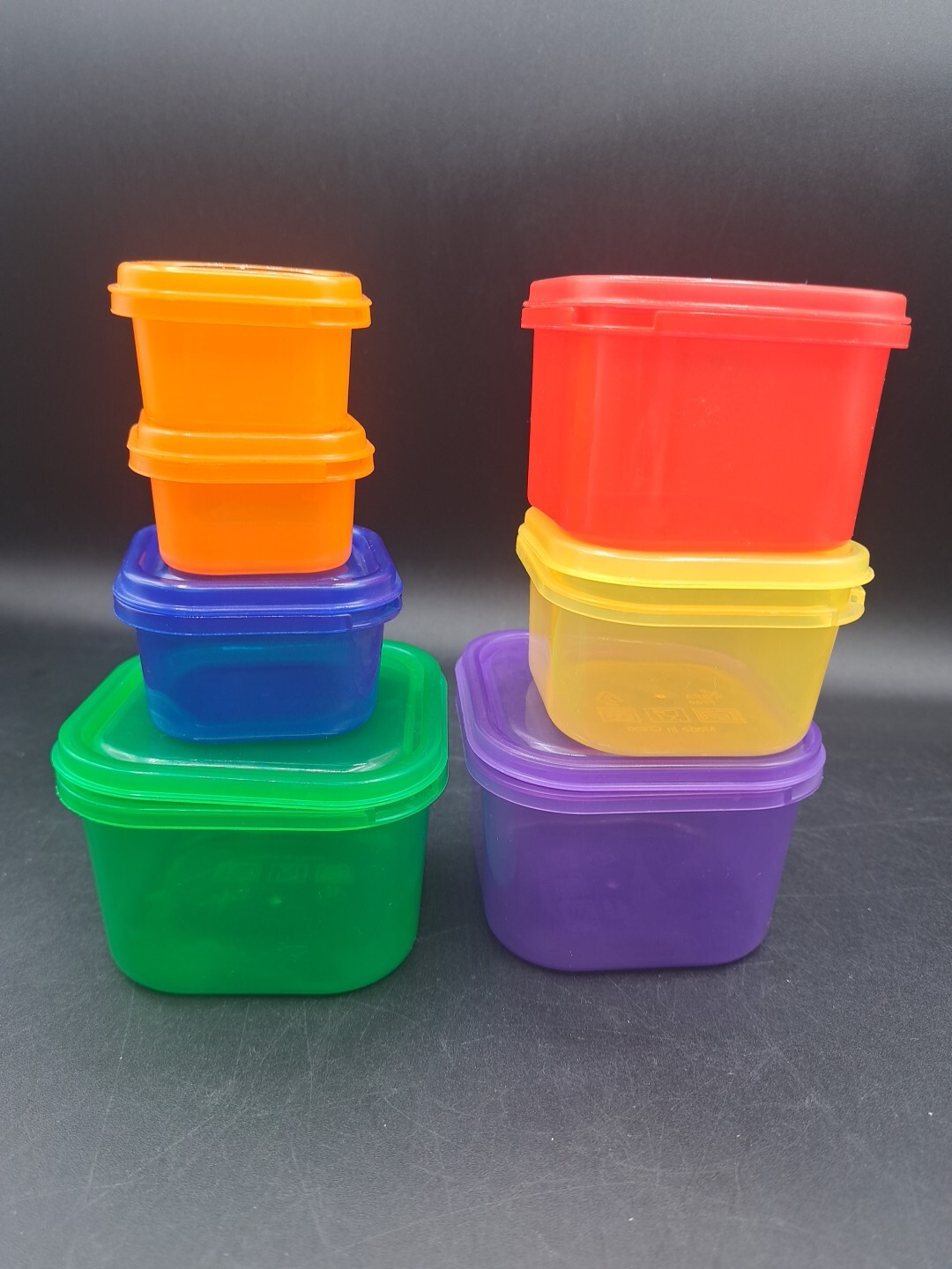 This is a 7-piece set of portion control containers from Beachbody, designed for a healthy diet and 21-day food plan. The containers are square in shape with snap lids, made of plastic in multicolor. They are airtight, reusable, stackable, microwave and dishwasher safe. The set includes containers and lids, suitable for portioning meals.