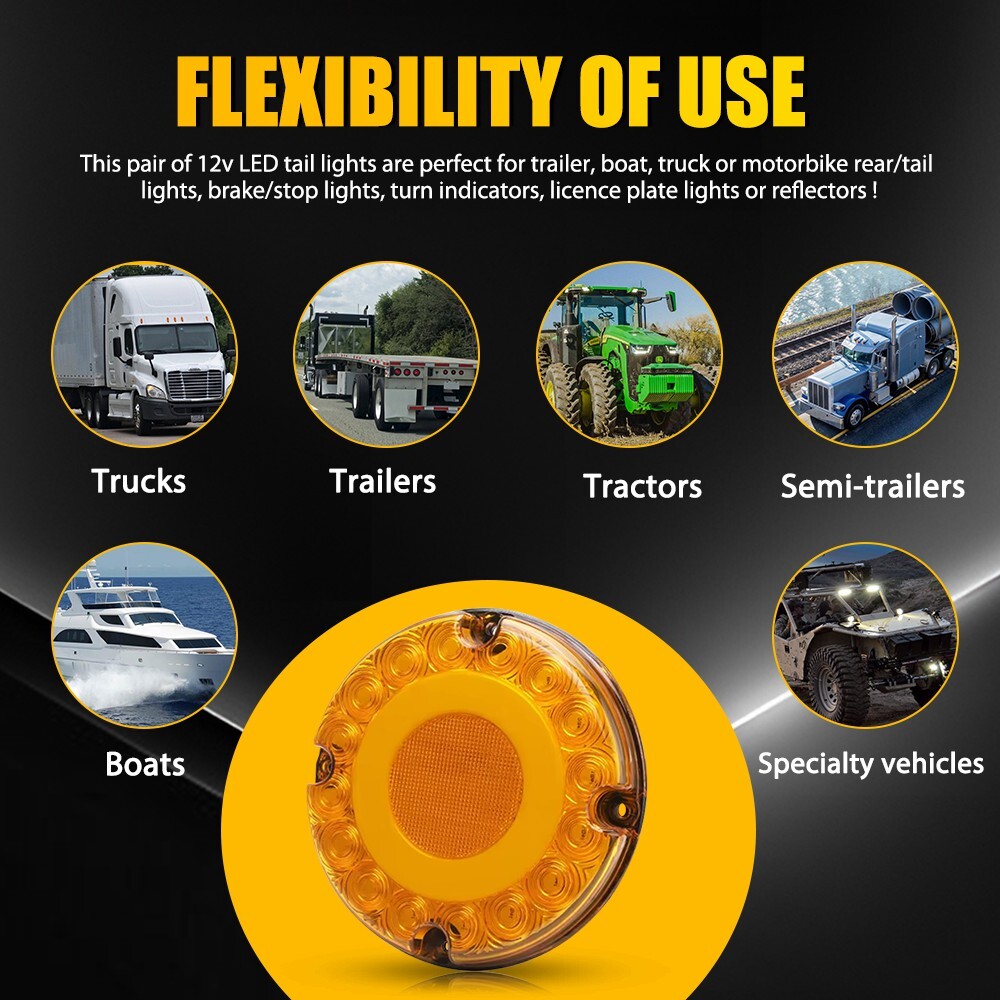Fit for: Suitable for truck, trailers, semi truck, caravans, campers, buses, vans, lorry, car, rv, bulldozer, crane, etc Specifications: Product Material: ABS+PC Light Color: Amber Voltage: 12-24V LED Quantity: 36 Size: 7inch round Functions: Brake light, tail light, turn signals, etc Wiring Mode: Black wire: Negative Red wire: Amber light on the outer ring of running light Yellow wire: Amber light in the inner circle of the brake light Blue wire: Flashing amber light Waterproof Grade: IP67 Lifespan: 50,000h+ Features: *High Brightness Each LED tail light bright enough and energy-saving. 7" Round 36-LED Amber Truck Trailer Bus Stop Turn Signal Tail Brake Light Flash Fit for: Suitable for truck, trailers, semi truck, caravans, campers, buses, vans, lorry, car, rv, bulldozer, crane, etc Specifications: Product Material: ABS+PC Light Color: Amber Voltage: 12-24V LED Quantity: 36 Size: 7inch round Functions: Brake light, tail light, turn signals, etc Wiring Mode: Black wire: Negative Red wire: Amber light on the outer ring of running light Yellow wire: Amber light in the inner circle of the brake light Blue wire: Flashing amber light Waterproof Grade: IP67 Lifespan: 50,000h+ Features: *High Brightness Each LED tail light bright enough and energy-saving. *Superior Quality Made of high quality material to ensure its low energy consumption, good waterproof and shock resistance. *Waterproof: The tail light has IP67 waterproof rating, which works even under extreme conditions such as rain and snow. *Wide Application This pair of LED tail lights can be used in truck, trailers, semi truck, caravans, campers, buses, vans, lorry, car, RV, bulldozer, crane, etc. It also can be used as brake light, daytime running light, tail light, turn signal light, etc. *Warm Notice Please check the detail information of the product carefully before purchasing. Your satisfaction is our utmost concern, please feel free to contact us for any questions and concerns. Packaging Include: LED tail lights*2 Item Specifics Brand : AUXITO Package Include : LED tail lights*2 Type : Tail Light Assembly Manufacturer Warranty : 1 Years Fitment Type : Direct Replacement Features 1 : High Brightness Features 2 : Superior Quality Features 3 : Waterproof Features 4 : Wide Application Features 5 : Warm Notice Material : ABS PC Light Color : Amber Fit for 1 : Suitable for truck, trailers, semi truck, caravans, campers, Fit for 2 : buses, vans, lorry, car, rv, bulldozer, crane, etc Voltage : 12-24V LED Quantity : 36 Size : 7inch round Functions : Brake light, tail light, turn signals, etc Black wire : Negative Red wire : Amber light on the outer ring of running light Yellow wire : Amber light in the inner circle of the brake light Blue wire : Flashing amber light Waterproof Grade : IP67 Lifespan : 50,000h+ Wire : 4-lines Payment (1) Instant PayPal payment is the preferred method of payment. (2) We also accept payment via PayPal, DebitCard, Visa, MasterCard, Discover. (3) We will only ship to the confirmed PayPal shipping address given with the payment. (4) If you want to ship to other address, please change your PayPal shipping address before you make payment. (5) To avoid initiating an unpaid item claim, please pay within 7 days. Shipping (1) We will ship your item(s) within 24 hours. (2) We ship this item to US usually via USPS first class mail. It usually takes 3-6 working days to deliver. Returns (1) We offer free return & money back guarantee. If you are not satisfied with your purchase for any reasons, you can return the item for refund or replacement/exchange. All returns must include the original packaging. (Please refer to our return policy for details.) (2) If you don't return goods within 60 days from date of purchase, your right to cancel will be revoked. Any items damaged because of incorrect installation will not be refunded. Please contact us for return or troubleshooting help prior to returning any products. (3) Unauthorized reselling of AUXITO products is strictly prohibited and we can't honor the warranty if purchasing from the unauthorized reseller. Contact Us [Our office hours are MONDAY - Saturday 9:00PM - 6:00PM PST, but we will response you once we get your message .There will be some delay on respons if you send message or E-Mail on Sundy.] (1).Negative feedback will not help resolve any problems you have, please contact us via eBay messages before leaving negative feedback, our customer service will make best effort to help you with the issues. (2).We maintain high standards of excellenceand strive for 100% customer satisfaction! Feedback is very important to us. We request that you contact us immediately BEFORE you give us neutral or negative feedback, so that we can satisfactorily address your concerns. FAQ Why swith to LED? LEDs not only give your vehicle a clean, modern look but, with proper use, will outlast any halogen bulb and HID bulb! Low energy draw, high lumen output, and instant on/off LED technology out shines stock bulbs in every way. Which bulbs are used in my vehicle? Check Sylvania automotive lamp replacemnt guide, you can select the year, make, and model of your vehicle, then select the application you want to replace or upgrade from stock. What does CAN Bus mean? CAN Bus means Controller Area Network Bus. This system monitors your vehicle and reports operating conditions. CAN Bus systems are commonly found in European vehicles such as BMW, Audi, Mercedes, Volkswagen, Porsche, and in many American vehicles. While most late model American vehicles have CAN Bus systems, it is always good to check with your vehicle dealer to see which system your vehicle has before purchasing electrical products. When do you need Warning Canceller? Some vehicles with cmplex internal computers(such as Audi,BMW,Jaguar,Mercedes,etc.) might report on-dash errors or flickering on the headlights. The warning canceller fixes the dashboard warning and flickering effect. Bulb Out Dashboard Error: On some vehicles, the dash