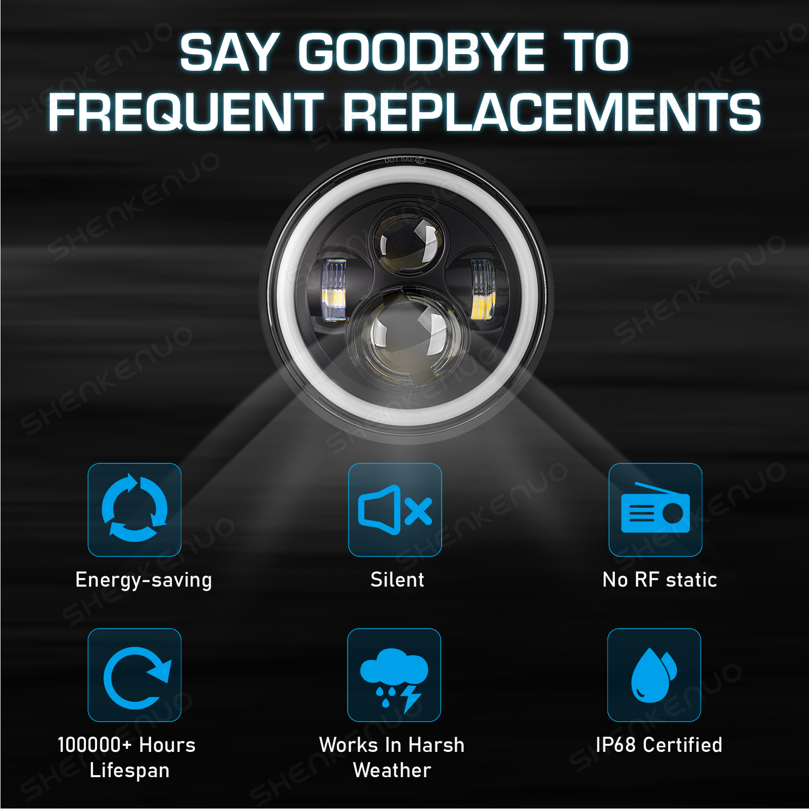 Welcome Pair 7" Inch Round LED Headlights Angle Eyes DRL For Jeep Wrangler TJ CJ JK LJ Fitment: Please verify these headlight fit for your vehicle before you purchase Fit for Jeep Wrangler TJ 2 Door 1997~2006 Fit for Jeep Wrangler LJ unlimited (4 Door) 2004~2006 Fit for Jeep Wrangler JK 2 Door 2 2007~2018 Fit for Jeep Wrangler Unlimited JK 4 Door 2007~2018 Fit for Jeep CJ-8 Scrambler 1981-1985 Fit for Jeep CJ-7 1976-1986 Fit for Jeep Wrangler 1997-2018 Fit for Land Rover Defender 90 1997 Fit for Land Rover Defender 90 1995 Fit for Land Rover Range Rover County Classic Sport Utility 4-Door 1995 Fit for Land Rover 90/110 1983 to 1991 (including 2.5N/A, 2.5 Turbo, V8) Fit for Land Rover 90/110 Defender 200 Tdi Fit for Land Rover 90/110 Defender 300 Tdi Fit for Land Rover 90/110 Defender Td5 Fit for Land Rover 90/110 Tdi Fit For Hummer H1 1992-2006 Fit for Chevy,GMC,Ford,Dodge,Toyota,Internatioal,Fiat,BMW,American Motors,Mercedes Benz,Mazda, Playmouth,Porsche,Pontiac,Subaru,Volvo etc. Motorcycle Fitment: Fit for 2006-2010 FLHTCUSE Models (Require Separate Wiring Harness, Not included in Package) Note : 2007 Electra Glid Ultra Classic Need Aftermarket Mouting Kit Fit for 1999-2003 Yamaha Road Star 1600 Fit for 2000-2003 Yamaha Road Star 1600 Midnight Fit for 1999-2003 Yamaha Road Star 1600 Silverado Fit for 2004-2009 Yamaha Road Star 1700 Fit for 2004-2007 Yamaha Road Star 1700 Midnight Fit for 2004-2007 Yamaha Road Star 1700 Midnight Silverado Fit for 2008-2011 Yamaha Road Star S Fit for 2004-2010 Yamaha Road Star Silverado Fit for 2008-2011 Yamaha Road Star Silverado S Fit for 2000-2009 Yamaha V Star 1100 Classic Fit for 1998-2009 Yamaha V Star 650 Classic Specifications: Power: 300W Quantity: 1 pair Light Type: LED Len Material: PC Housing Color: black Voltage: DC 10-30V Certification: CE, ROHS Waterproof Rate: IP68 Life Time: over 50,000 hours Color Temperature: 6000K-6500K white Housing Material: die-casting aluminum Lighting Pattern: high beam/low beam Angel Eyes Light Color: white (DRL) / yellow (turn light) Size (D*H): approx. 178mm (7")*62mm (4") (Sold in pair) Aftermarket high strength 7” round LED headlights with white/ yellow angel eye 500% brighter than the stock headlights, enhance visibility when driving at night Four modes: high beam-all LEDs on, Low beam-only three side LEDs on, DRL-white angel eye on, turn light-yellow angel eye on Dramatically improve external appearance, add an aggressive styling to your vehicle Instruction is not included, professional installation is highly recommended Package Included: 2 x 7" LED Headlights Shipping Information Return & Exchanges Contact Us Warm Tips FAQ Shipping Information Shipping Information Domestic(U.S.) Shipping All items will be shipped out within 1 or 2 business days with cleared payment. Please included your phone number to the payment note for prompt and secure shipment. Tracking numbers for all orders are added to eBay once they have been dispatched; please login to eBay to find the tracking information for your order. Most items are shipped USPS first class mail, delivery usually takes just 4-6 business days. Additionally, we do not ship on weekends. International Shipping Puerto Rico: As we use standard USPS, PR is considered a US territory for mailing purposes, and can be selected as such at checkout. Shipping will be domestic U.S. rates. For Canada & Mexico or other countries We use the eBay's Global Shipping Program. Once you’ve paid for your item, we'll send it to the global shipping center within 1 or 2 business days. From there, it's sent to you. Lost Shipments For non-signature required shipments: If the tracking information that corresponds to a shipment confirms that the product was delivered to the intended address, the customer assumes all responsibilities and liabilities for the receipt of the shipment.The Customer is the one who provided SHENKENUO with the ship to information, and in doing so absolves SHENKENUO of any liabilities for missing or stolen deliveries. Customs Fees for International Shipping Shipments are marked with the value of your purchase price. International customers are responsible for any tariffs or customs fees that may be associated with their shipment. Please check your country's laws and regulations before your purchase. Return & Exchanges Return Policy For U.S. and Puerto Rico Customers: We offer free returns with any orders within 30 days from the date of delivery. No restocking fees, no administrative fees , no return shipping fee, and no hassle! We will email you when a prepaid return label is ready to download from your ebay account. You just have to print it out and drop the package off at a USPS facility. When we get it back, you will be notified and credited for the full price of the items/products that are returned. Since the shipping fees go directly to the delivery service, we are not able to refund any shipping costs . For warranty returns passed the 30 days, please call or email us so we can make sure we are providing you with the best possible support. Exchanging an Order for U.S. Customers We are happy to help you exchange your items, for any reason, within 30 days of the date of delivery. There will be no additional shipping charge for the new items. You are responsible for return shipping costs. Contact Us If you have ANY questions with shipping, product or service, please Contact Us first before leaving feedback/write a review or filing a return case. We will solve the problem!If you have ANY questions with shipping, product or service, please Contact Us first before leaving feedback/write a review or filing a return case. We will solve the problem!We always put our customers first and your satisfaction is guaranteed. Our Tech's are here to serve you. Email us and our expert team will swiftly diagnose the issue and offer the best solution within 12-24 business hours. All off-hours emails will be answered within 24-48 hours. Warm Tips 1. Not available for aftermarke