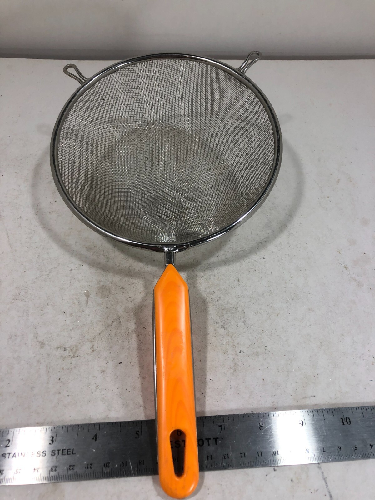 Household use kitchen equipment Strainer wire mesh ideal for blanching, straining broth, gravy, sauces, pastas, jams, sifting flour, sugar, and many more usage stainless steel 6"handle with plastic insert to ensure safe griping One layer of fine wire mesh with 2 ear rest on the end of the skimmer which can be use to rest over stock pot Excellent to strain the smallest food such as rice or herbs! excellent home kitchen utensils