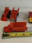 7pc Lot 1979 1989 Hot Wheels & Matchbox Dump Trucks + Tractor ~ there are 4pc 1:140 Matchbox 1989 Dump Trucks, 2pc 1979 Hot Wheels Red Long Bed Dump Trucks, & 1 Hot Wheels 1991 Red Tractor. NOTE: the two long bed red dump trucks are missing their back gates, also the lot shows some cosmetic wear consistent with being played with as shown in photos, includes all 7 pieces.