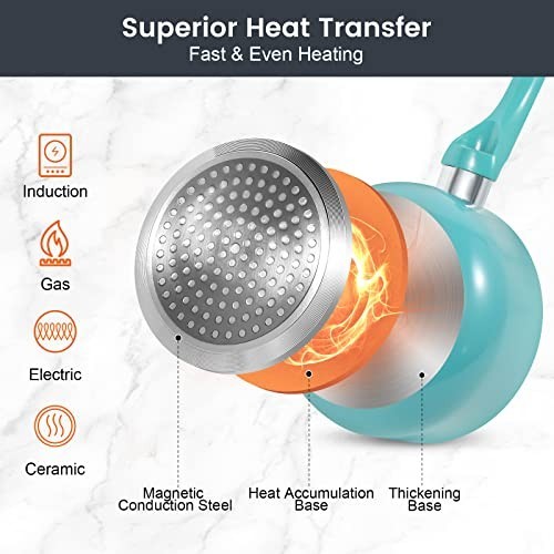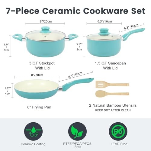 All in One Little Set: High-Quality Kitchen Pots and Pans Discover the ultimate kitchen companion with this versatile cookware set, perfect for compact kitchens and everyday cooking needs. This set includes: 8" Non-Stick Frying Pan 1.5 Quart Saucepan with Lid 3 Quart Casserole Pot with Lid 2 Natural Bamboo Kitchen Utensils Nonstick Ceramic Cookware Experience the joy of cooking with our long-lasting ceramic nonstick coating, ensuring an enjoyable cooking experience and effortless cleaning. Our cookware is 100% free of PFAS, PTFE, PFOA, lead, and cadmium. Simply rinse or wipe with a damp paper towel for quick and easy cleanup. Stay Cool Bakelite Handles Designed with your comfort and safety in mind, the ergonomic bakelite handles are non-slip, heat-resistant, and easy to grip. The durable glass lids feature an air hole for ventilation, allowing you to easily view your food while cooking and lock in the best taste. Quick & Even Heating Crafted from heavy-duty aluminum, this cookware set heats up quickly and evenly. It features a high magnetic conductive steel base, making it compatible with all stovetops, including induction. For optimal performance, low or medium heat is recommended. Beautiful Pots and Pans Set Aesthetically pleasing and functional, this vibrant turquoise ceramic cookware set is perfect for everyday cooking. Its attractive design makes it an ideal choice as a cookware starter set for family use or as a thoughtful housewarming gift.