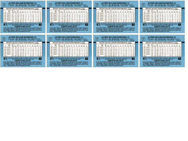 (8) 1988 Donruss #419 Bill Schroeder Milwaukee Brewers Card Lot Condition: NM