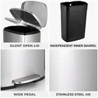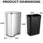 Description: Step trash can is constructed of brushed stainless steel. Surface treatment of stainless steel wire drawing makes it easier for you to clean the kitchen trash can an keep it clean all the time. The back side has a convenient handled bucket for easy lifting. A strong wide steel pedal is designed to last, and the soft-close lid ensures a smooth, silent close every time. Suitable for all kinds of occasions, kitchen, bedroom, living room. Stainless steel trash can is convenient and practical, you can place it anywhere you need Specification: Whole Dimensions: 13.6"W x 9.3"D x 24.6"H. Height with lid open: 32.5" Pedal Size: 5.9''*1.6'' Inner Buckets: 13"W x 9"D x 22.6"H. Note: Manual measurement, there may be errors Stainless Steel&ABS Buckets: Kitchen trash can is made of 410 stainless steel and adopts a wire drawing process. It has a delicate appearance and is easy to clean. Trash can uses detachable ABS inner barrel is convenient for garbage disposal and of garbage bags. Quiet Closing&Lid-lock: Heavy-duty garbage can is built with integrated step pedal mechanism and the force damper, which soft open and close lid while preventing slamming and banging. Lid-lock can help keep trash can open without stepping if you are inconvenient to keep stepping on pedal. Large&Enduring Foot Pedal: Stainless trash can features 5.9" wide pedal, providing a comfortable stepping surface, making it effortless to open the lid. It is crafted from sturdy stainless steel ensuring smooth and reliable operation for years to come Portable Handle: Potable handle in the back of trash can is easy for you to move it to anywhere you need. Rubbish can uses oval-shaped lid, If you don't want the whole house to smell like you don't like, you just need to make sure that the lid of trash can is always closed Bag Holder& Side Handle: Hole design in the back of inner buckets will fix the trash bag well, avoiding the excess part of the garbage bag from accumulating on the side of the barrel. And side handle on both sides of inner buckets help you take out of buckets easily