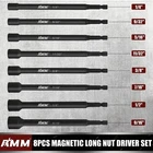 8PCS SAE Magnetic Nut Driver Set for impact drill, Long Nut Drivers 6 INCH (1/4" - 9/16"), 1/4” Hex Shank Nut Driver Bit, Cr-V Steel VARIOUS SIZES: AMM 8 PCS SAE impact nut driver setter includes 1/4", 9/32", 5/16", 11/32", 3/8", 7/16", 1/2", 9/16" nut drivers with handy storage rails. BUILT TO LAST: The impact driver set is crafted from Cr-V steel with Black Phosphate Coating. This material ensures longer service-life, higher shock-resistance, and strong resistance to oxidation and corrosion. MAGNETIC EXCELLENCE: Each impact nut driver set contains a high-strength magnet and the nut driver bit set has a deep interior to keeps the bits securely in place while loosening or tightening nuts or bolts. By using gravity-pressed embedded magnets, there is no risk of the magnet falling off. EXTRA LONG 6 INCH: 6" long nut drivers provide easy maneuvering in narrow spaces and hard to reach areas. Each impact drill bit tool is laser-etched for easy identification. WIDELY USED: The impact nut driver set magnetic features a universal 1/4" hex shank for easy attachment to a variety of tools, including drills, electric screwdrivers, socket wrenches, pneumatic impact wrenches, cordless drills, and screw guns.