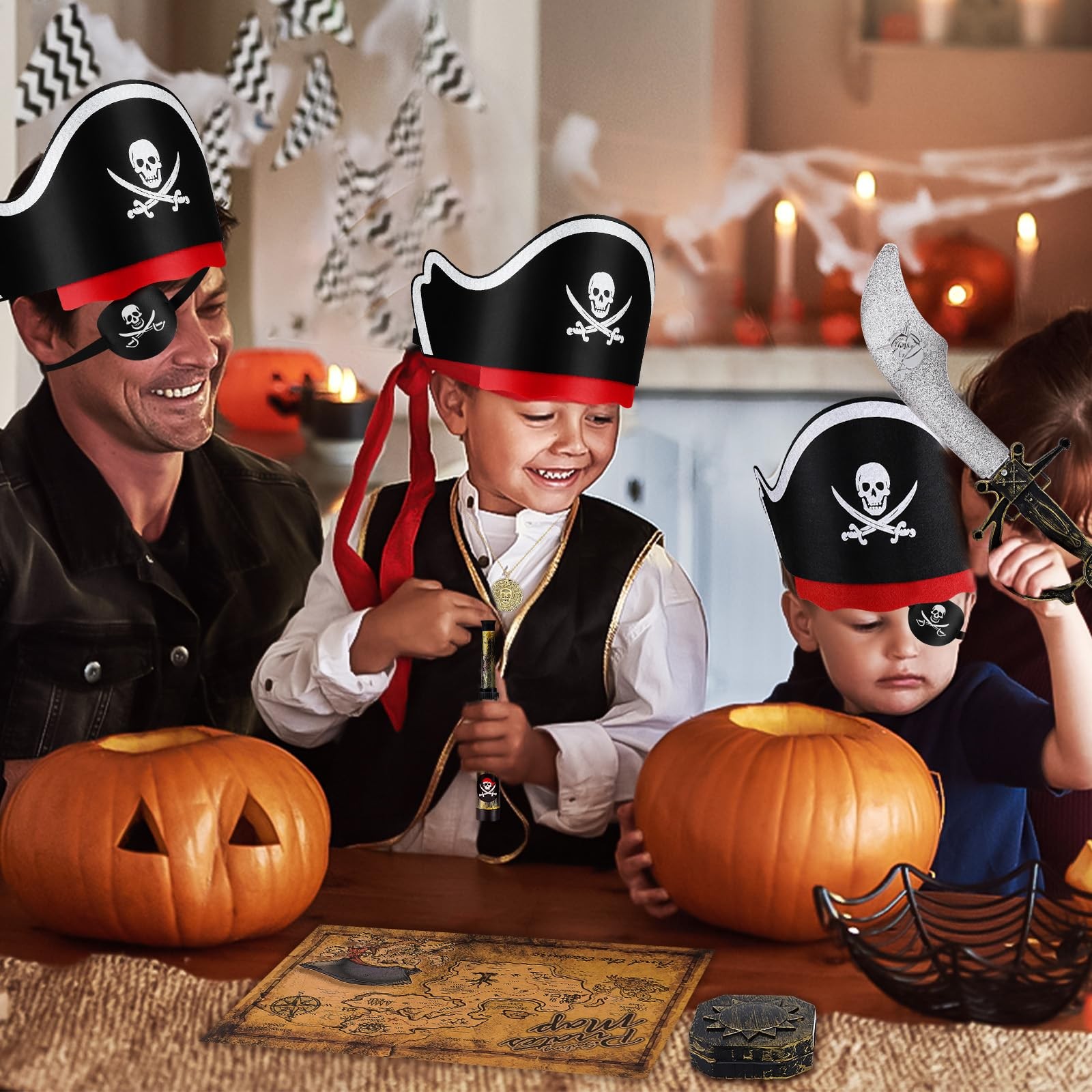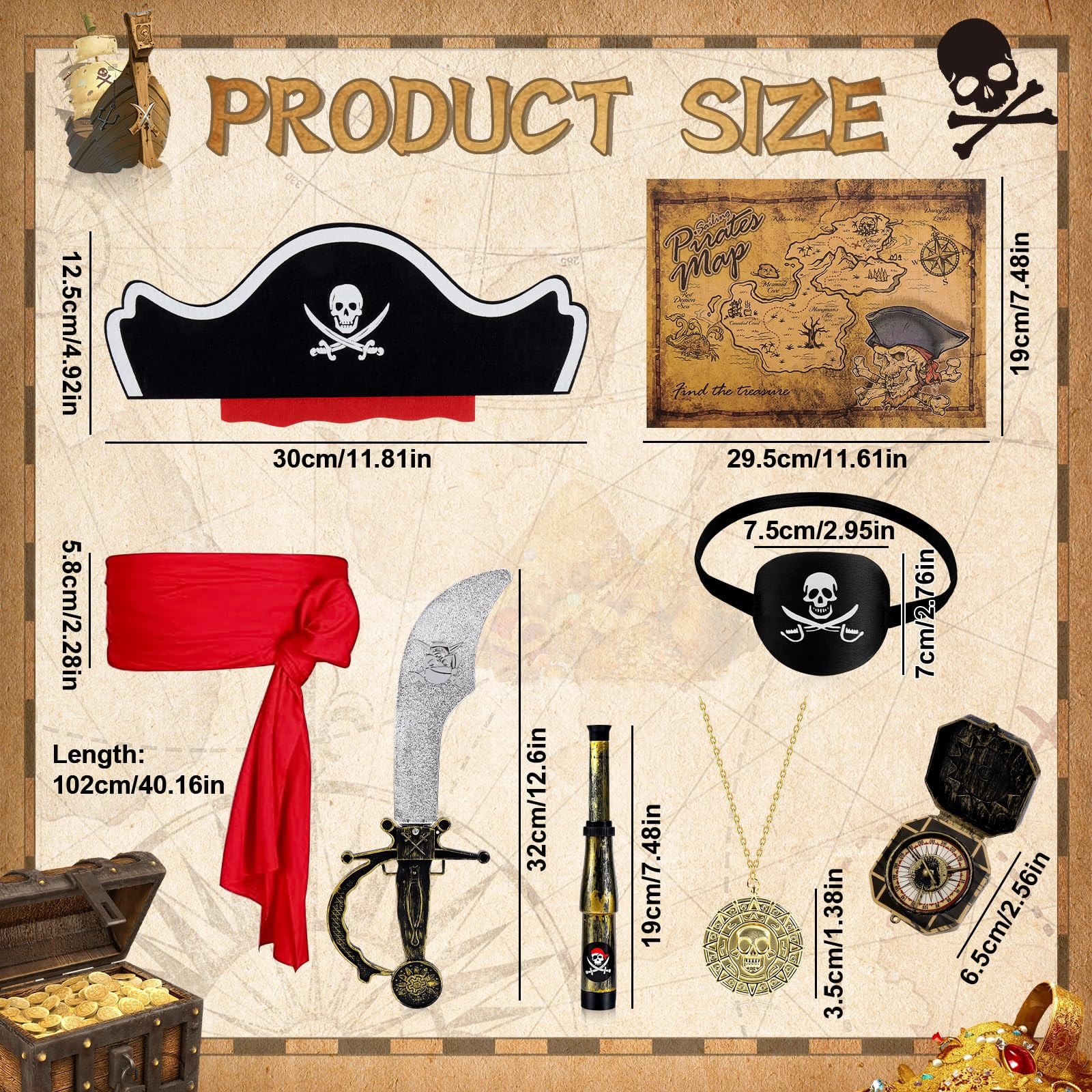 Pirate accessories are ideal cosplay props for Halloween cosplay, Pirate Accessories Set: You will get 8pcs pirate costume accessories set include 1 pirate hat, 1 pirate headscarf, 1 pirate eye patch, 1 pirate map, 1 pirate sword, 1 pirate compass, 1 pirate binocular, A wide range of pirate costume sets are available to meet your dress up needs, with a clever combination of pirate sets to give you a more realistic pirate look Pirate Accessories Themed Design: Pirate eye patch, hat, sword and telescope are designed with classic skull patterns. Plastic pirate sword is about 13 inches long, lightweight, blunt plastic that does not hurt. Pirate telescope is easy to adjust One Size Fits Most: Black captain eye cover and hat equipped with a black elastic strap, the pirate bandana of pirate costume can fit a wide range of head sizes, suit for most people to wear, providing you with a comfortable experience Wide Applications: These pirate costume accessories, as perfect accessories for a pirate costume, suit for Halloween party, pirate theme party, pirate night, fright night, pirate day, birthday, Christmas, masquerades, carnivals, stage performances and more Perfect Gift for Pirate: Searching for a unique, exciting gift that sparks joy and creativity? the pirate costume accessories is the ideal choice for family, who love adventure! Whether it’s for role-playing games, Halloween, birthday parties, or themed events, this costume transforms them into a bold, swashbuckling pirate—turning ordinary playtime into an epic journey of exploration