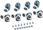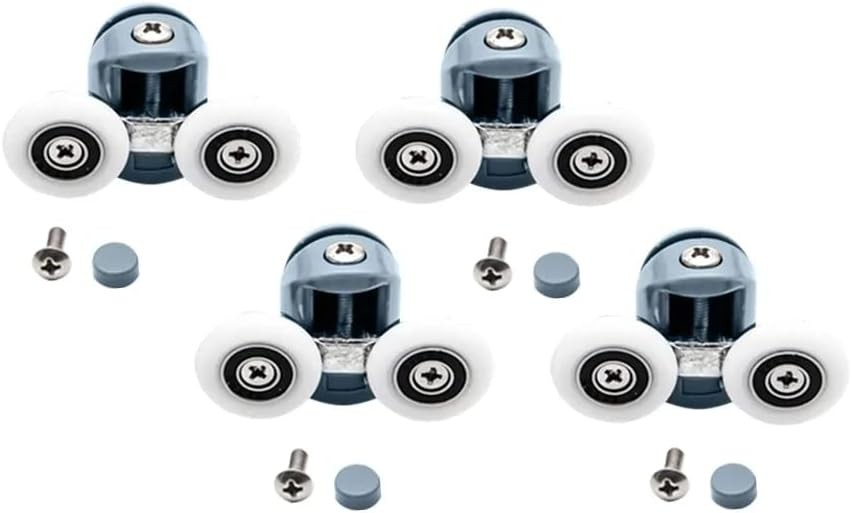 About this item Package includes: 4 double upper rollers and 4 single bottom rollers, in total 8 pcs Comes with screw cover caps. Spring loaded action can also fit curved showers. Designed with a nut and a plastic cover. Material: Plastic, Nylon, and stainless steel Diameter of the wheel: 23mm; Width of the wheel: 6mm. Minimum Hole size in the glass: 11mm. Maximum glass thickness: 6mm 8 pcs Double Shower Door Wheels Size: 2.36 x 0.79 x 0.79 inches