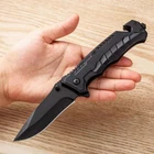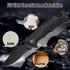 Knife type: folding knife You buy here a very high quality outdoor folding knife of the brand The extremely sharp blade, is made of stainless steel and can be opened comfortably with one hand, by means of flip function. The knife meets all the criteria you would expect from a Survival pocket knife! In addition to an extremely high overall stability of the knife, it additionally has a belt cutter and a glass breaker. In addition, you can easily carry your faithful companion with you with the existing belt clip and have your tools at hand at any time. Whether you are carving, cutting, guttering, refining or crushing, the robust, ergonomically shaped handle made of aluminium is perfect for you and carbon perfect in the hand. Features: robust and wear-resistant, sharp and durable, easy to carry, suitable for hand shape, carefully selected materials, mini and compact, foldable Specificaiton: Blade length: 9cm Blade angle: 50 ° Length of knife handle: 110mm Application: Outdoor, Self-defense Material: aluminium alloy+stainless steel 3cr13 Applicable audience: It is not recommended for minors to buy and use, and during use supervision by adults is required. P ackage included: 1 x Knife