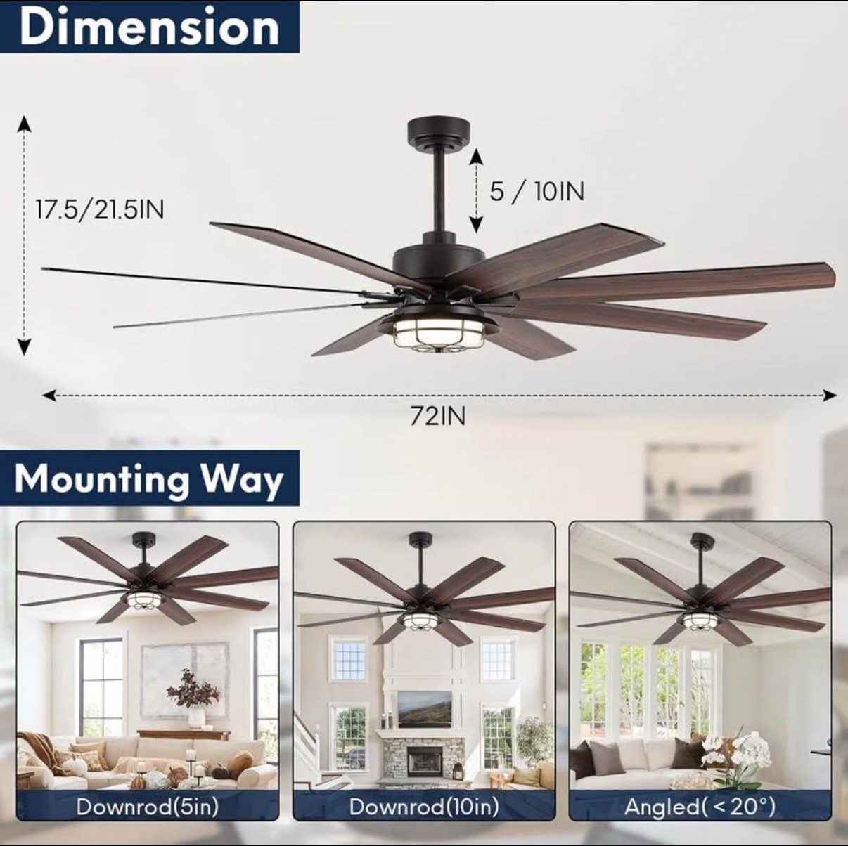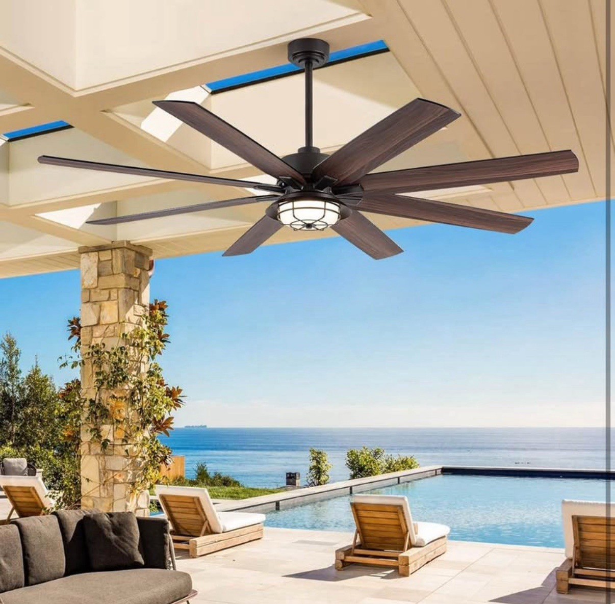 The 8 aBlade Waterproof Outdoor Ceiling Fan with Light is a modern, 72-inch fan designed for outdoor use in patios. It features a remote control for easy operation, warm white LED light, and six speeds for customizable airflow. The black fan has a waterproof finish and a stylish design, perfect for the 21st century era. With its 8 blades and corded power source, this ceiling fan offers both functionality and aesthetics for outdoor spaces.