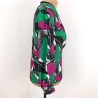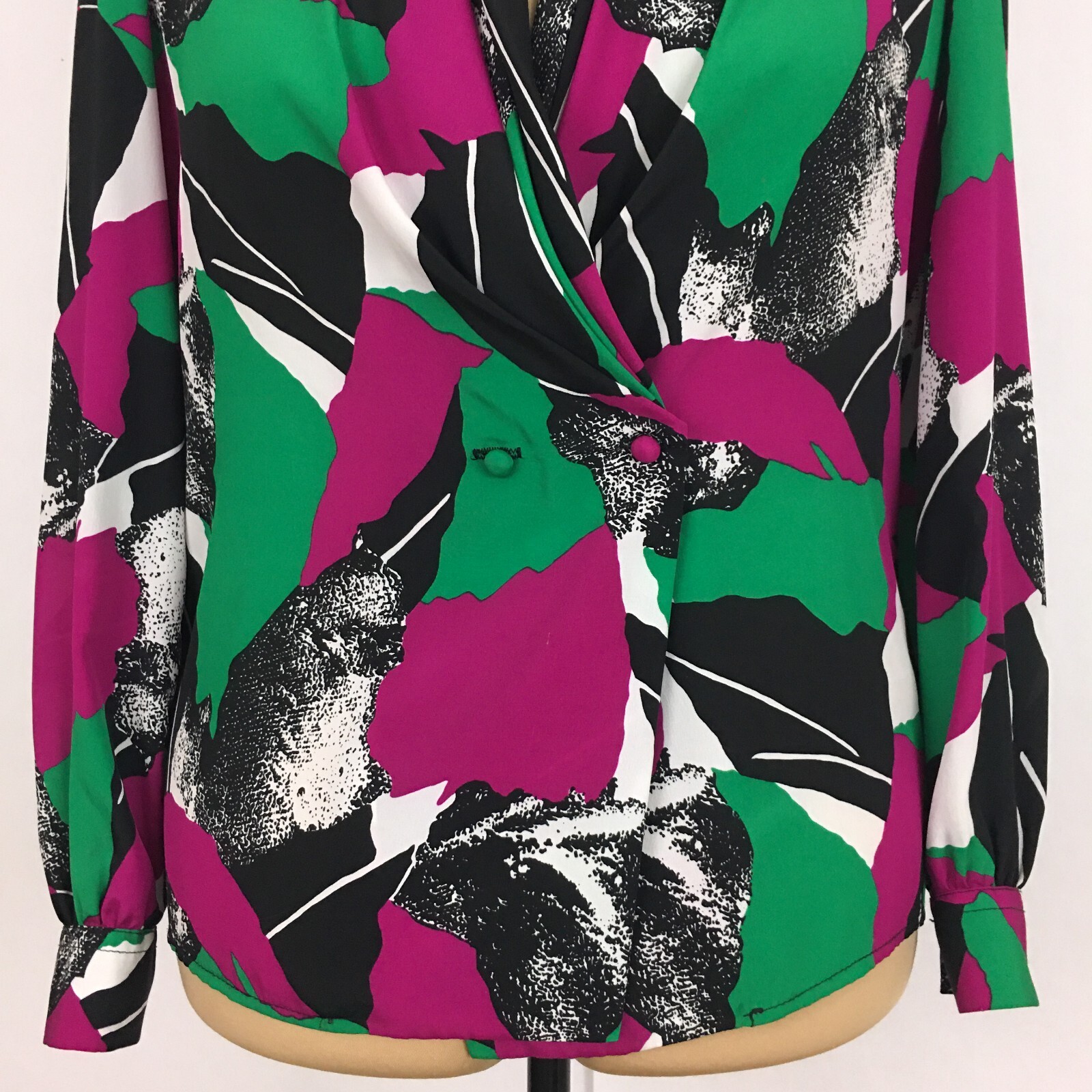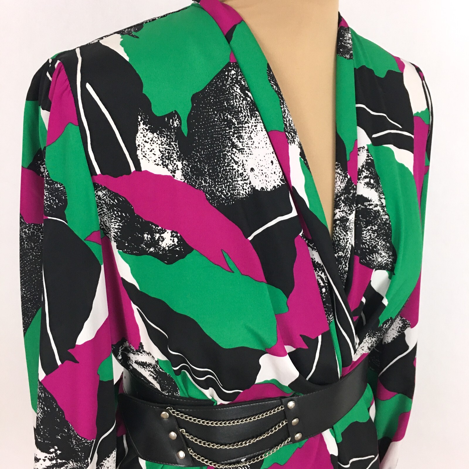 PLEASE NOTE: Watched items do NOT get price drop notifications since my account is a personal seller account, not business. • Bold Abstract Blouse • ✓ Condition: Like new; Pls see all pictures as they are part of the description, Does not include belt ✓ Size: Missing tag, listed as Medium based on its fit on me and my mannequin, mannequin measurements are below ✓ Style: Wrap blouse ✓ Neckline: Collarless v neckline ✓ Sleeve: Long sleeve, Puff ✓ Closure: 2 Front buttons ✓ Pattern: Abstract bold pattern in magenta pink, green and black ✓ Fabric: Missing tag, but it's very lightweight and flowy • Mannequin Measurements: Shoulder 40.5" / Chest 39" / Waist 32" • Any stock photos used are for fit only. Remaining pics are of the actual item you'll receive. I do my best to be thorough. If I missed something, please let me know, at the latest, the day after it was delivered so we can work out a resolution. Thank you! ** ? Cat friendly, ? smoke free home