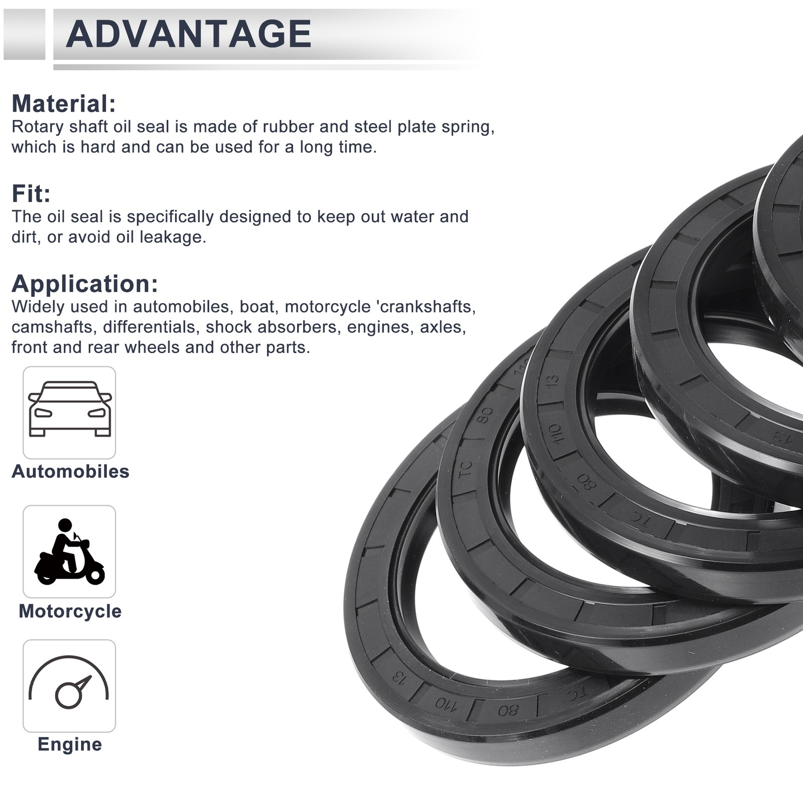 Document Features:The oil seal is specifically designed to keep out water and dirt or avoid oil leakage. Prevent dust into inside of the machine, and prevent lubricating oil from leaking.Rotary shaft oil seal is made of Nitrile Rubber and and steel plate spring which is water and oil resistance, heat resistant, good sealing, wear resistant, anti static. Durable and can be used for a long time.Widely used in automobiles, boat, motorcycle 'crankshafts, camshafts, differentials, shock absorbers, engines, axles, front and rear wheels and other parts.It is widely used in automotive sealing products, but it is not suitable for phosphate series hydraulic oils and gear oils with extreme additives.Specifications:Type:TC Double Lip w Steel SpringMaterial:Nitrile RubberInner Diameter:80mmOuter Diameter:110mmWidth:13mmInstallation:1. Clean the mounting surface, ensure that the mounting surface is clean; 2. Use the appropriate amount of lubricant, avoid too much or too little;3. Ensure that the installation of the oil seal is oriented correctly, with the lips facing the rotating shaft; 4. Avoid over-tightening during installation to avoid damaging the oil seal.Package includes:5 TC Double Lip w Steel Spring Oil SealNote:Please check the dimension of the product for consistency before purchasing.Regularly check the sealing effect of oil seals and replace damaged oil seals in time. Shop Category New Arrival Hot Item Oil Seal Seal Ring Rotary Shaft Seal Nitrile Rubber 80x110x13mm Black 5 Pcs Features: The oil seal is specifically designed to keep out water and dirt or avoid oil leakage. Prevent dust into inside of the machine, and prevent lubricating oil from leaking. Rotary shaft oil seal is made of Nitrile Rubber and and steel plate spring which is water and oil resistance, heat resistant, good sealing, wear resistant, anti static. Durable and can be used for a long time. Widely used in automobiles, boat, motorcycle 'crankshafts, camshafts, differentials, shock absorbers, engines, axles, front and rear wheels and other parts. It is widely used in automotive sealing products, but it is not suitable for phosphate series hydraulic oils and gear oils with extreme additives. Specifications: Type:TC Double Lip w Steel Spring Material:Nitrile Rubber Inner Diameter:80mm Outer Diameter:110mm Width:13mm Installation: 1. Clean the mounting surface, ensure that the mounting surface is clean; 2. Use the appropriate amount of lubricant, avoid too much or too little; 3. Ensure that the installation of the oil seal is oriented correctly, with the lips facing the rotating shaft; 4. Avoid over-tightening during installation to avoid damaging the oil seal. Package includes: 5 TC Double Lip w Steel Spring Oil Seal Note: Please check the dimension of the product for consistency before purchasing.Regularly check the sealing effect of oil seals and replace damaged oil seals in time. Item Specifics Brand X AUTOHAUX Material Nitrile Rubber Type TC Double Lip w Steel Spring Oil Seal Manufacturer Part Number Does Not Apply Product Name TC Double Lip w Steel Spring Oil Seal Net Weight 375g Shell Color Black Interchange Part Number Does Not Apply Other Part Number Does Not Apply Dimension 80x110x13mm Package Content 5 Pcs Oil Seal Note This is not oem product,accessory only. MPN Does Not Apply upc 678202516317 You Should Know If you have any questions, please feel free to contact our customer service. Our response will be faster than eBay! Our Handling Time: within 24 hours on weekdays eBay Handling Time: 72 hours About Us Shipping Feedback Payment Contact Us Angstrom Autohaus is based in Hong Kong, our group comprises factories in Asia that manufacture OEM and aftermarket automotive parts and accessories. We believe in FACTORY DIRECT purchases. Our mission is to deliver Lower Prices and Better Quality to consumers and distributors wherever, whenever. We operate from a distribution center in Hong Kong, where we perform sourcing, quality control and fulfillment. We strive to ensure that our products are reliable, updated and that our transactions are smooth and speedy. We are positioned to bring you the latest consumer automotive aftermarket parts and accessories globally and round the clock. We are proud to have served over 500,000 ebay buyers worldwide. International Buyers - Please Note: Import duties, taxes and charges are not included in the item price or shipping charges. Buyers are responsible for these charges. Please check with your country's customs office to determine what these additional costs will be prior to bidding/buying. Note that delivery times may vary, particularly during peak periods or inclimate weather conditions. All items will be dispatched from our warehouse in China or Hong Kong directly. Due to Custom restrictions, we do not ship lighters to US We cannot ship on weekends and we do not offer Saturday, Sunday or holiday delivery. All our items will be shipped to buyer's PayPal address, please confirm your address on PayPal before you bid. We left positive feedback for you after receiving payment. Your feedback is very important for us, positive feedback and 5 Score DSR is highly appreciated. Please let us know before leaving any negative feedback or 1 point, 2 point low DSR or open any disputes on Paypal and Ebay, please give us the opportunity to resolve any problems and we will try our best to satisfy your needs. If any question, please feel free to contact us via 'Ask seller a question' ,We try our best to reply to your emails as soon as possible, due to high volume of daily incoming emails and time zone difference, we may not be able to reply your emails immediately.Please allow 1-2 business days for us to response. Payment Methods: We accept eBay payment. We appreciate prompt payment and look forward to your business in the future. Unpaid item will be filed without receiving payment in 7 days from listing ended. Contact Us Please email us to resolve any problem before you leave any feedback to us. W