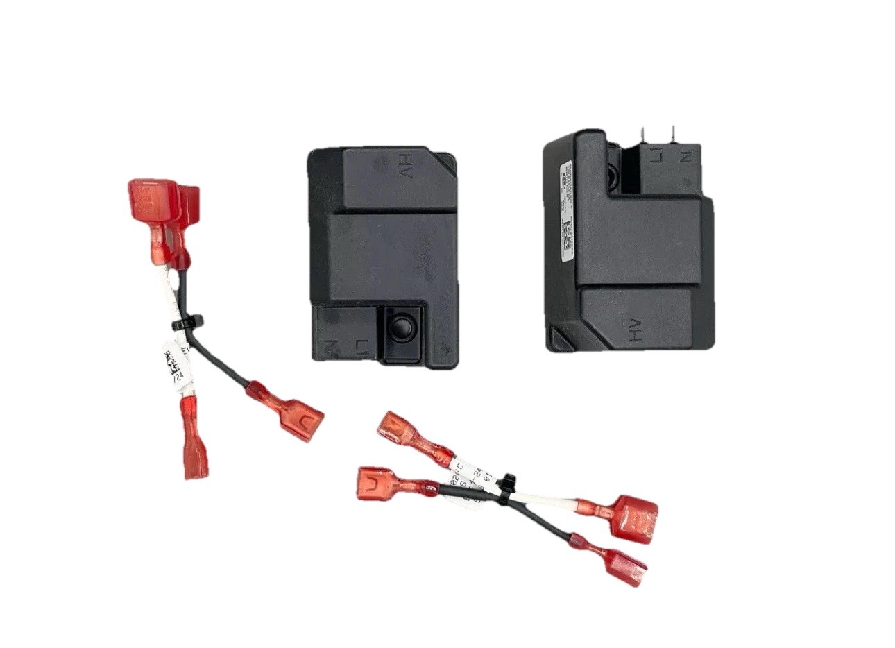 The 829045 Wolf Kit is a set of two spark modules specifically designed for Wolf ranges and cooktops. These black matte plastic modules are built-in and integrated, powered by electricity, and factory certified as a genuine Wolf part. Compatible with various Wolf models such as CG243, CG304, CG365, GR, DF, RT, SRT484W, and SRT362W, this kit ensures a proper fit and reliable performance for your cooking appliance. Made in the United States, this set includes everything necessary for a seamless installation and maintenance of your Wolf range or cooktop.