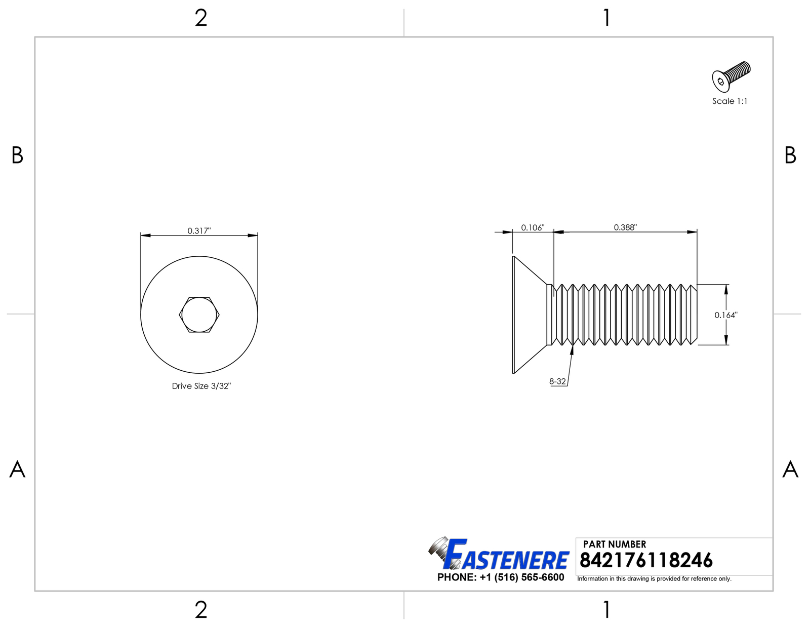 8-32 x 1/2" Flat Head Socket Cap Screws Allen Drive Stainless Steel Qty 1000 The stainless steel socket cap screw has a plain finish and a flat head with an internal hex drive. Stainless steel resists corrosion and may be magnetic. The flat head is cone shaped for use in countersunk holes and has a flat top that fits flush with the mated surface. The internal hex drive, also known as a hex-socket drive, has a hexagonal slot that requires an Allen key driver, also known as a hex key or Allen wrench. Socket cap screws are threaded fasteners that have a cap head with an internal socket drive for installing in areas with limited side clearance. These screws are available with a variety of head shapes, which determine how the screw interacts with the mating surface, and drive styles, which determine the type of tool required to install the screw. General Product Information Head Style : Flat Drive Style : Allen Hex Key Drive Size : 3/32" Thread : 8-32 Overall Length : 1/2" Quantity of Fasteners in Package : 1000 Detailed Product Information: Head Diameter : Head Height : 0.106" Countersink Angle : 82 Degree Thread Diameter : 0.164" Threads Per Inch (TPI) : 32 Coarse or Fine Thread : Coarse Thread Coverage : Full Thread Thread Length : 0.388 Key Notes: Flat head socket cap screws have a internal hex drive that can be driven with an allen key or hex bit and a machine thread that will match up to any internally threaded item with the same machined thread patern which is apart of the unified thread system Flat head screws have a flat top that tapers down to a cone shape that will sit flush into a countersunk hole and give a finished appearance 82 degree flat head is the most common countersunk screw head angle These flat socket cap screws are made of a high quality 18-8 grade stainless steel that offers a great corrosion and chemical resistance that will stand strong against the elements. Flat head countersunk machine screws length are measured from the top of the flat head to the end of the thread and the thread length is the overall length minus the height of the head Shipping: All orders placed before 3:30 pm EST Will Ship Same Day Tracking is provided on ALL Orders Priority Mail Shipping service is offered at a discount of only $3.95 UPS Ground UPS Next Day Air is available, Please inquire for pricing Returns : ALL returns are accepted if returned within 60 days. Money Back or exchange guaranteed. NO Restocking Fees. For YOU, we constantly strive to find ways of improving our performance.