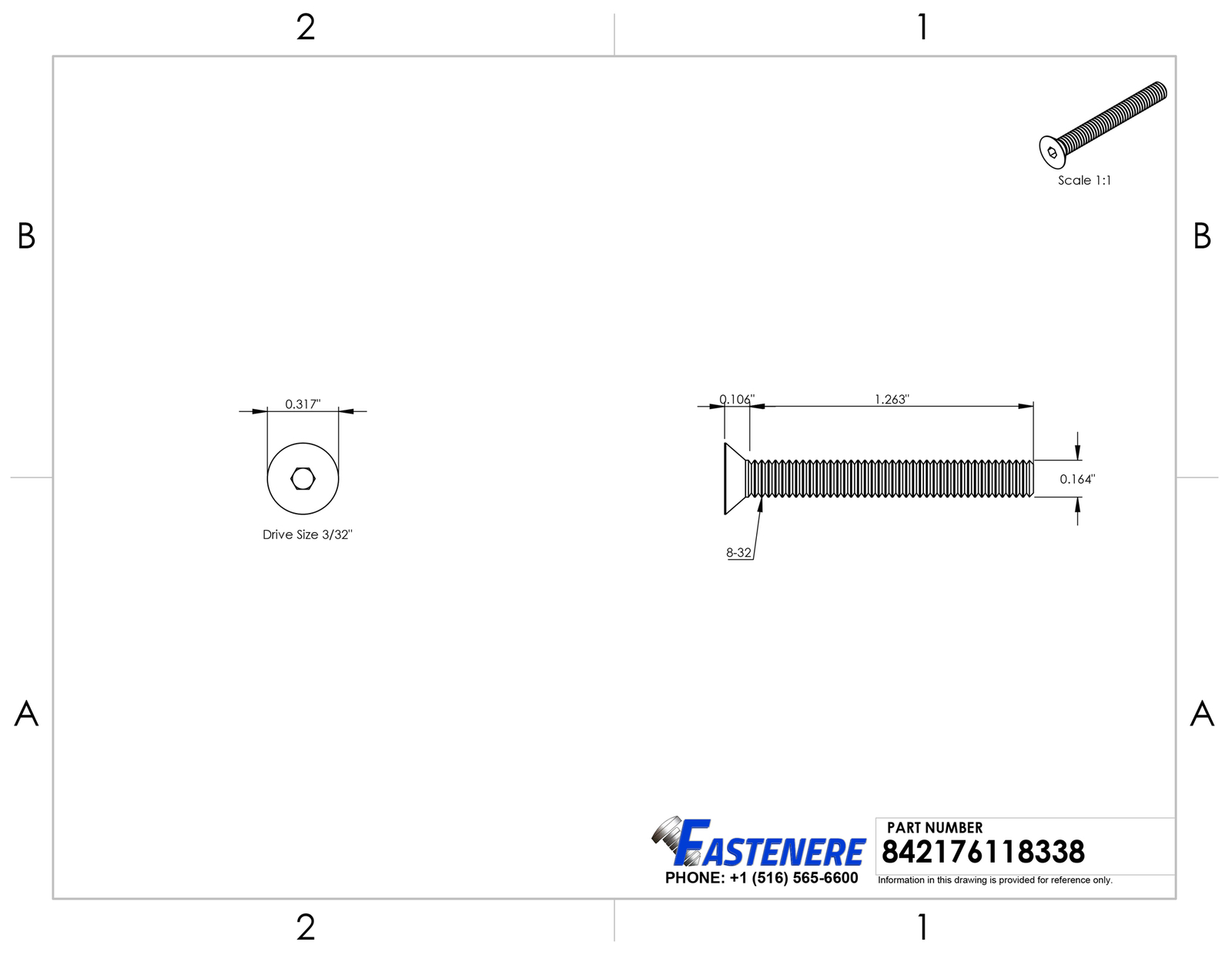 8-32 x 1-3/8" Flat Head Socket Cap Screws Allen Drive Stainless Steel Qty 1000 The stainless steel socket cap screw has a plain finish and a flat head with an internal hex drive. Stainless steel resists corrosion and may be magnetic. The flat head is cone shaped for use in countersunk holes and has a flat top that fits flush with the mated surface. The internal hex drive, also known as a hex-socket drive, has a hexagonal slot that requires an Allen key driver, also known as a hex key or Allen wrench. Socket cap screws are threaded fasteners that have a cap head with an internal socket drive for installing in areas with limited side clearance. These screws are available with a variety of head shapes, which determine how the screw interacts with the mating surface, and drive styles, which determine the type of tool required to install the screw. General Product Information Head Style : Flat Drive Style : Allen Hex Key Drive Size : 3/32" Thread : 8-32 Overall Length : 1-3/8" Quantity of Fasteners in Package : 1000 Detailed Product Information: Head Diameter : Head Height : 0.106" Countersink Angle : 82 Degree Thread Diameter : 0.164" Threads Per Inch (TPI) : 32 Coarse or Fine Thread : Coarse Thread Coverage : Full Thread Thread Length : 1.263 Key Notes: Flat head socket cap screws have a internal hex drive that can be driven with an allen key or hex bit and a machine thread that will match up to any internally threaded item with the same machined thread patern which is apart of the unified thread system Flat head screws have a flat top that tapers down to a cone shape that will sit flush into a countersunk hole and give a finished appearance 82 degree flat head is the most common countersunk screw head angle These flat socket cap screws are made of a high quality 18-8 grade stainless steel that offers a great corrosion and chemical resistance that will stand strong against the elements. Flat head countersunk machine screws length are measured from the top of the flat head to the end of the thread and the thread length is the overall length minus the height of the head Shipping: All orders placed before 3:30 pm EST Will Ship Same Day Tracking is provided on ALL Orders Priority Mail Shipping service is offered at a discount of only $3.95 UPS Ground UPS Next Day Air is available, Please inquire for pricing Returns : ALL returns are accepted if returned within 60 days. Money Back or exchange guaranteed. NO Restocking Fees. For YOU, we constantly strive to find ways of improving our performance.