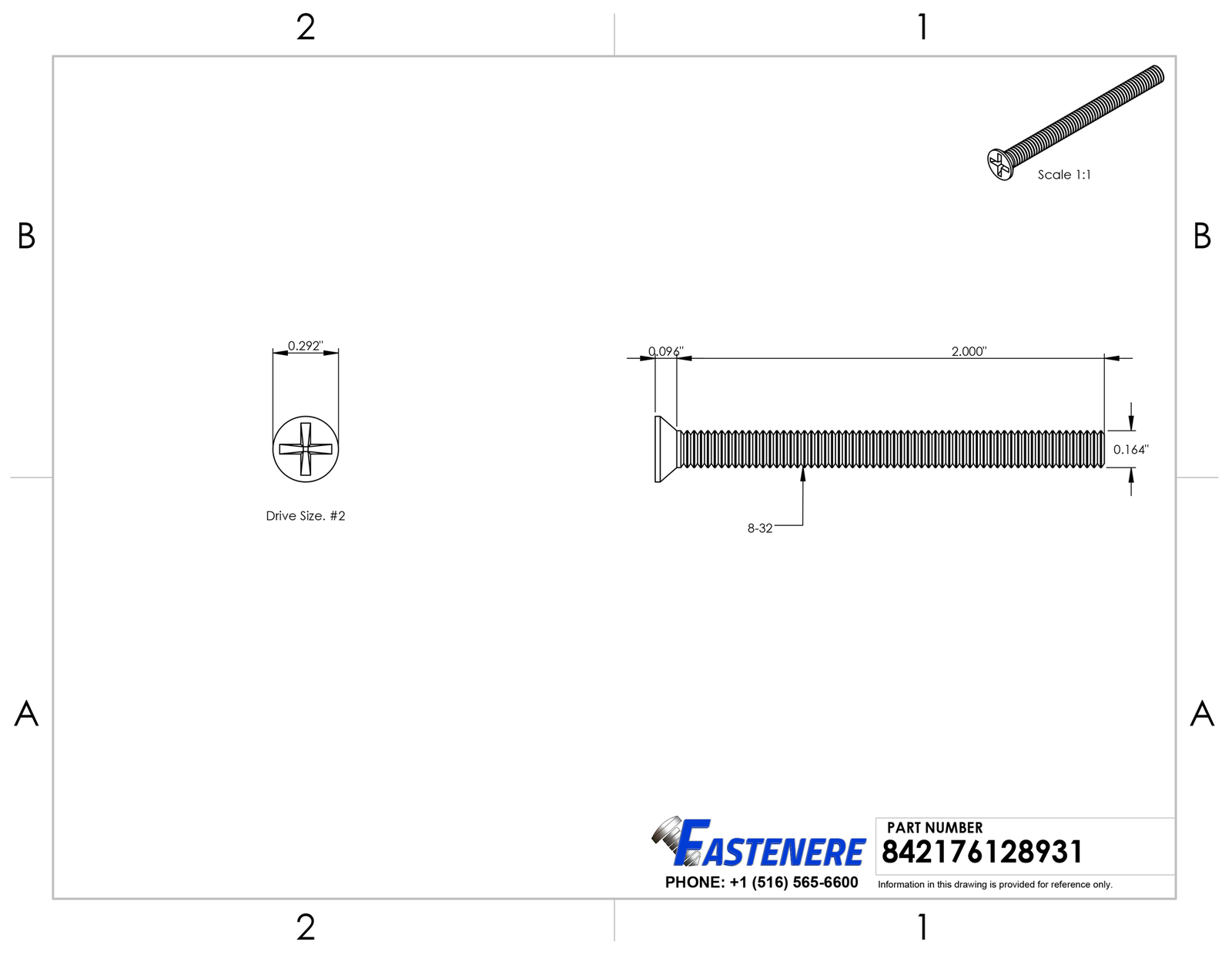 8-32 x 2" Flat Head Machine Screws Stainless Steel 18-8 Qty 2500 Machine screws are often used with nuts but also often driven into tapped holes (without nuts). They might be considered a screw or a bolt based on the Machinery's Handbook distinction. In practice, they tend to be mostly available in smaller sizes and the smaller sizes are referred to as screws or less ambiguously as machine screws, although some kinds of machine screw can be referred to as stove bolts. A flat head is A head with flat top and a conical bearing surface (bottom). Designed to be Countersunk. Rod with spiral threads the entire length and with one flat end and a head on other end. Holds object to another object that has a pre-threaded hole, frequently a nut. Usually manufactured from metal. Can be rotated into or out of the object using a screwdriver or wrench. General Product Information Flat Head Screws Length is Measured from the top of the Head to the Tip Head Style : Flat Drive Style : Phillips Drive Size : #2 Thread Size : 8-32 Overall Length : 2" Material : Stainless Steel 18-8 Quantity of Fasteners in Package : 2500 Detailed Product Information: Head Diameter : Head Height : 0.096" Countersink Angle : 82 Degree Thread Diameter : 0.164" Threads Per Inch (TPI) : 32 Coarse or Fine Thread : Coarse Thread Coverage : Full Thread Thread Length : 2.000 Key Notes: Stainless steel flat head machine screws with a phillips drive and a machine thread that will match up to an internally threaded item with the same machined thread patern Flat head screws have a flat top that tapers down to a cone shape at an 82 degree and will sit flush into a countersunk hole giving a finished appearance These machine screws are made of a high quality 18-8 grade stainless steel that offers a great corrosion and chemical resistance that will stand strong against the elements providing a long lasting product and giving many years of service 82 degree is the most common countersink screw head angle for machine screws with a flat head Flat head countersunk machine screws length are measured from the top of the flat head to the end of the thread Shipping: All orders placed before 3:30 pm EST Will Ship Same Day Tracking is provided on ALL Orders Priority Mail Shipping service is offered at a discount of only $3.95 UPS Ground UPS Next Day Air is available, Please inquire for pricing Returns : ALL returns are accepted if returned within 60 days. Money Back or exchange guaranteed. NO Restocking Fees. For YOU, we constantly strive to find ways to improve our performance.