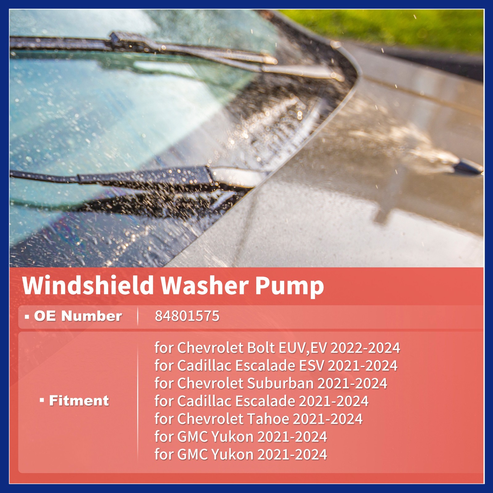 Items Included: Washer Pump Net Weight: 147g Material: Plastic Fitment 2: for Cadillac Escalade ESV 2021-2024 Other Part Number: 84801575 Note: This is not oem product,accessory only. Fitment 6: for GMC Yukon 2021-2024 Fitment 7: for GMC Yukon 2021-2024 Product Name: Washer Pump Dimension: 3.9"x3.4"x2.6" California Prop 65 Warning: Cancer and Reproductive Harm - www.P65Warnings.ca.gov - Brand: switchpart Package Content: 1 Pc Windshield Washer Pump with Grommet Type: Washer Pump Shell Color: Black Fitment 5: for Chevrolet Tahoe 2021-2024 Placement on Vehicle: front Fitment 3: for Chevrolet Suburban 2021-2024 Universal Fitment: No Superseded Part Number: 84801575 Attachment Type: Insert Country of Origin: China Manufacturer Warranty: none Manufacturer Part Number: 84801575 Fitment 1: for Chevrolet Bolt EUV,EV 2022-2024 OE/OEM Part Number: 84801575 Interchange Part Number: 84801575 Fitment 4: for Cadillac Escalade 2021-2024