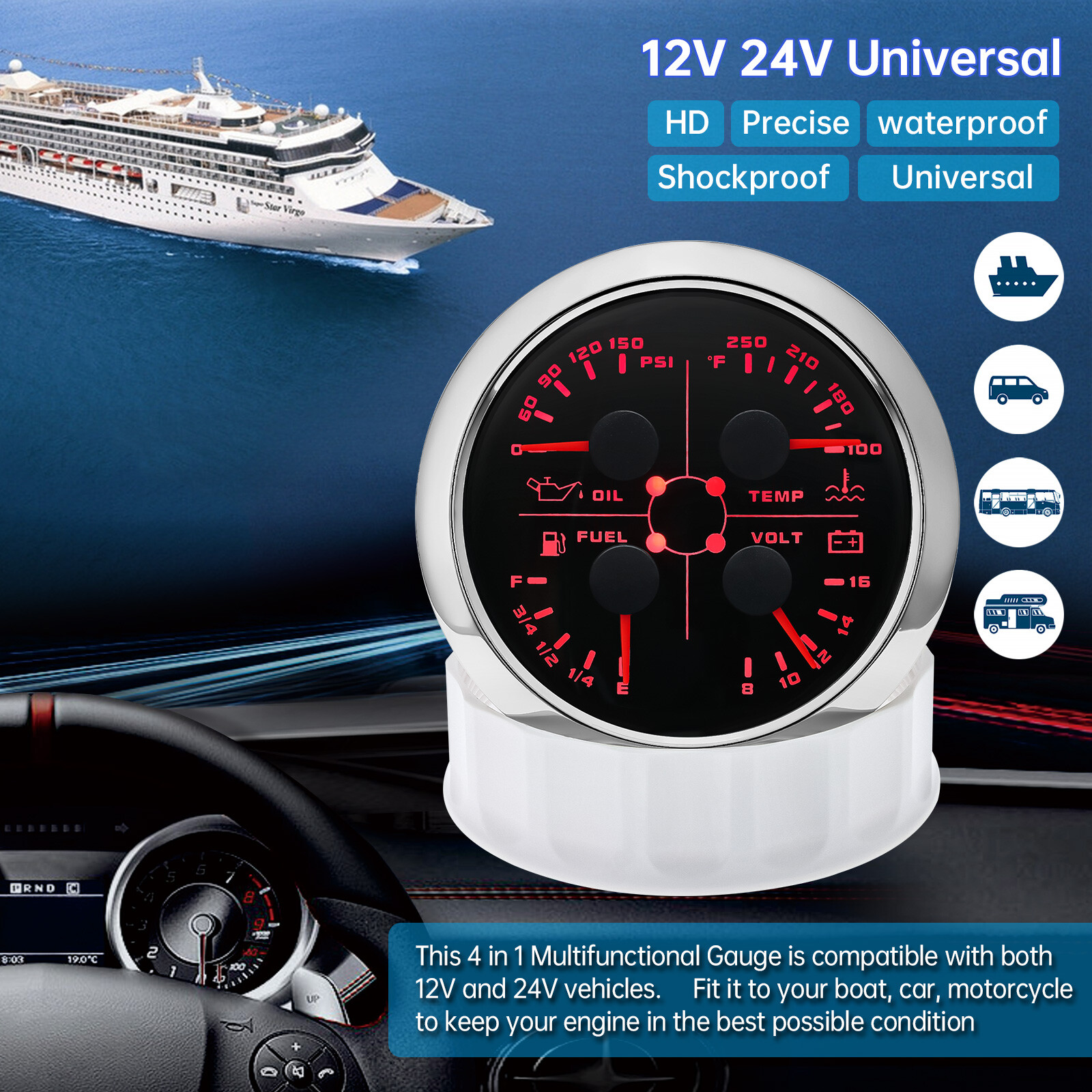2 Gauge Set 85mm GPS Speedometer 120MPH w/Tacho 0-8000RPM & 85mm 4 in 1 Gauge 2 Gauge Set 85mm GPS Speedometer 0-120MPH w/ 85mm Fuel Level Water Temp Oil Pressure Volt Features: Suitable for all vehicles and off-road vehicles The signal comes directly from the satellite signal receiver(GPS Antenna), don't need other speed sensor. The gauge has the advantages of high precision, quick location confirmation and short start up time. IP67 waterproof and dustproof grade Reverse polarity protection and anti-fogging performance Stepper motors used for full range of stepping gauges, great feature with its less power consumption, longer life, higher precision, etc. Most importantly, the gauge is easy to setup, and can be used in all vehicles, boats and off-road vehicles. Speedometer Specifications: Application: Universal fit for Motorcycle/ Boat/Truck/Bus/Car Electronic Speedometer (stepper motor) No Mechanic Sensor, get speed signal from GPS Speed ≠0 and show accurate speed in tunnel with the help of accelerometer Total Mileage Adjustable GPS Blind Area Odometer Compensation OverSpeed Buzzer Alarm (Value Adjustable) Indication Light (Left, Right and High Beam Installation Diameter: 85mm (3 3/8") Speed Range: 0~120MPH RPM Range : 0~8000RPM Mileage Range: 0-99999.9miles Working Voltage: 12V/24V Working temperatures: - 40 to 85°C Protection rank: IP67 Waterproof Reverse polarity protection and anti-fogging performance 4 IN 1 Gauge Technical Data: Fixing dimension: 85mm Indicating Range: Oil press. meter: 0-150PSI Water temp. meter: 100-250℉ Fuel level meter: 0-190ohms/240-33ohms, empty-full; The signal can be adjusted Voltmeter: 8-16V Working Voltage: 12V Input Signal: 10-184ohms for 0-10Bar oil pressure meter; 0-190ohms for fuel level meter;(Default 0-190ohms, can adjust to 240-33ohms) 8-16V voltage meter; Input Signal 320-22ohms for water temperature meter Red backlight Protection grade is IP67, the whole body is completely waterproof; Excellent antifogging function; 316 Stainless steel bezel with curved glass; Convenient Installation by multi-plug socket connecting way; Accessories: matched with connectors, Installation Instruction Package Included: 1 x 85mm 4 in 1 Multifunctional Gauge 1 x 85mm GPS Speedometer Gauge 1 x GPS Antenna 2 x Cable 2 x Installation Instruction