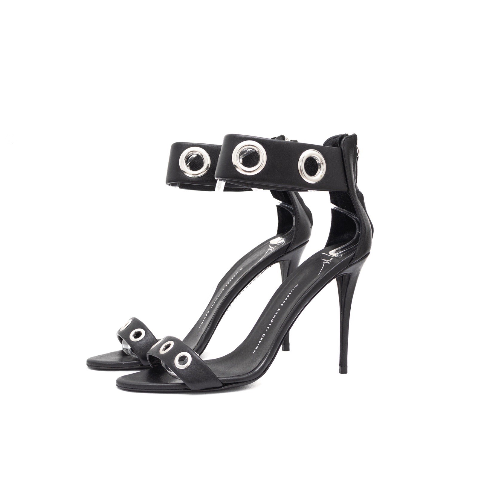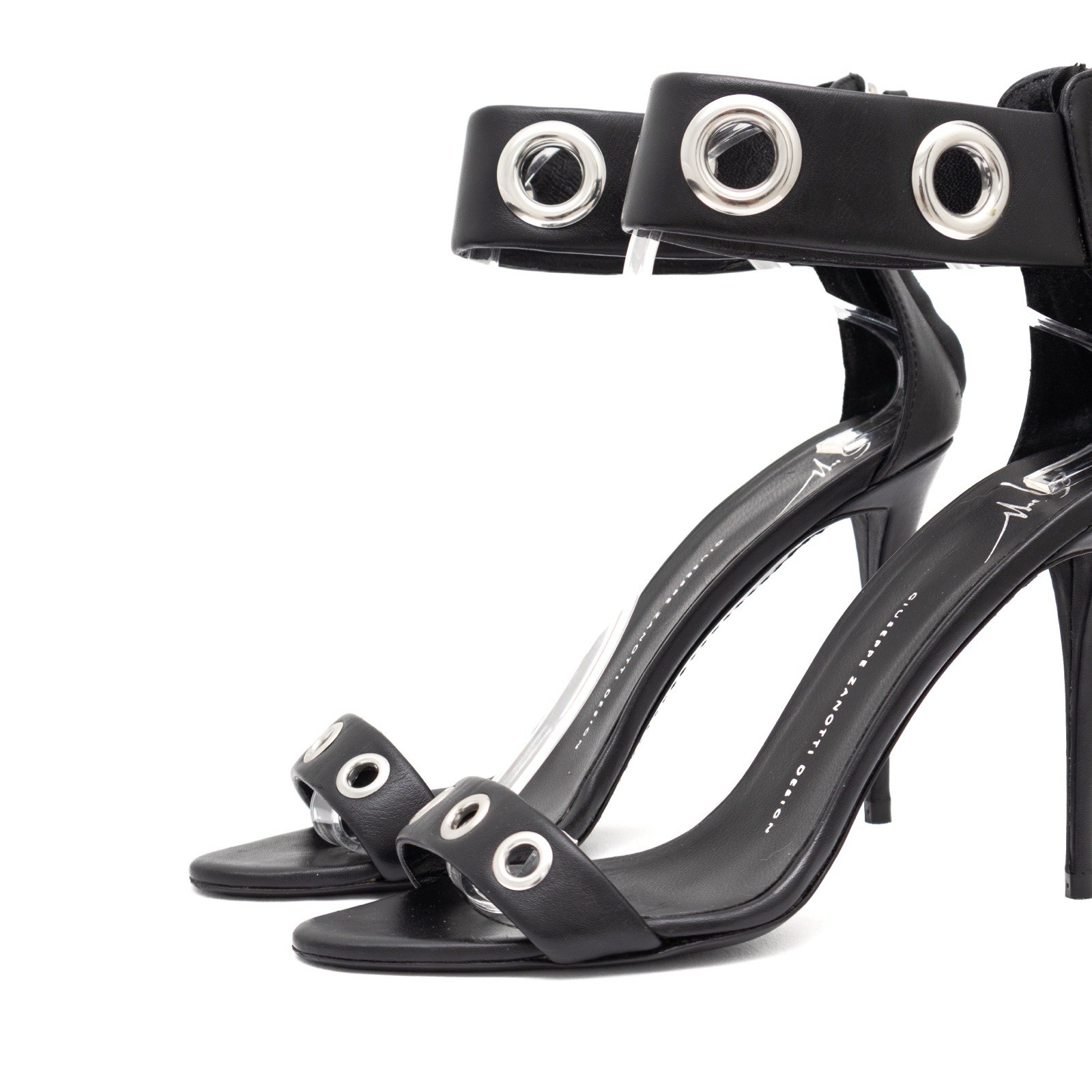 875$ Giuseppe Zanotti Black Leather Eyelet Ankle Strap Sandals Size: 40 US 10 - Size US 10; EU 40 - 8/10 Good Preowned Condition - 100% Authentic - 100% Leather - Leather Sole - Made in Italy - RRP 875$ - Self-covered heel, 3¾" - eye-catching broad ankle straps along with zipped counters - eyelet detailing - Strap Design - Famous Brand - Very Comfortable - Premium Quality - Minimalistic Design - Beast for Casual Looks