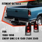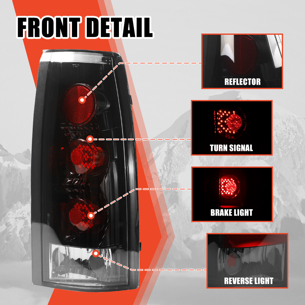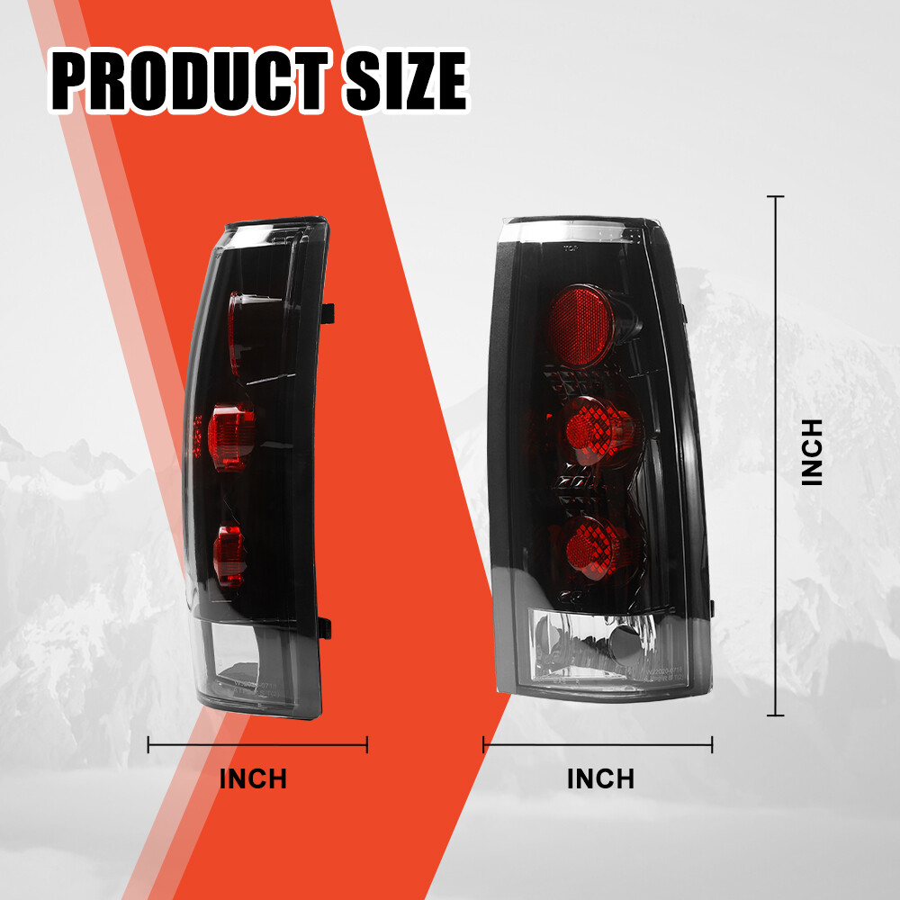 Specification: Bulb Type: Integrated LED Brake / Running Lights: LED (Included) Turnning Lights: LED (Included) Backup Lights: 3156 (Bulbs NOT Included, please use the original light bulbs) Material: ABS,PC,PMMA(OEM Grade) Color Finish: Glossy Black Housing / Clear Lens Fuction: Brake Light / Parking Light / Turn Signal Light Certification: DOT / SAE Compliance Wiring Harness: Not Included (plug and play) Replace OEM Number: L: 5977867,5976897; R: 5977868,5976898 Partslink Number: L: GM2800104,GM2800125; R: GM2801104,GM2801125 Fitment: Chevy 1988-1998 Chevy C/K 1500,2500,3500 1992-1999 Chevy Suburban C/K 1500, 2500 1995-1999 Chevy Tahoe 2000 Chevy Tahoe Limited, Z71 Models 1992-1994 Chevy Blazer GMC 1992-1999 GMC Suburban C/K 1500, 2500 1992-1999 GMC Yukon 2000 GMC Yukon Denali Model Cadillac 1999-2000 Cadillac Escalade ※ Only fit for Fleetside Model, w/o 15000 LB GVW, Not Compatible For Stepside Bed Model & 15000LB GVW Design Model Package Includes 1 Pair Tail Lights (Driver & Passenger Side) 2 Resistors