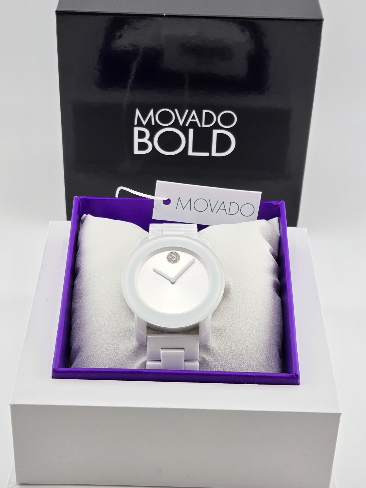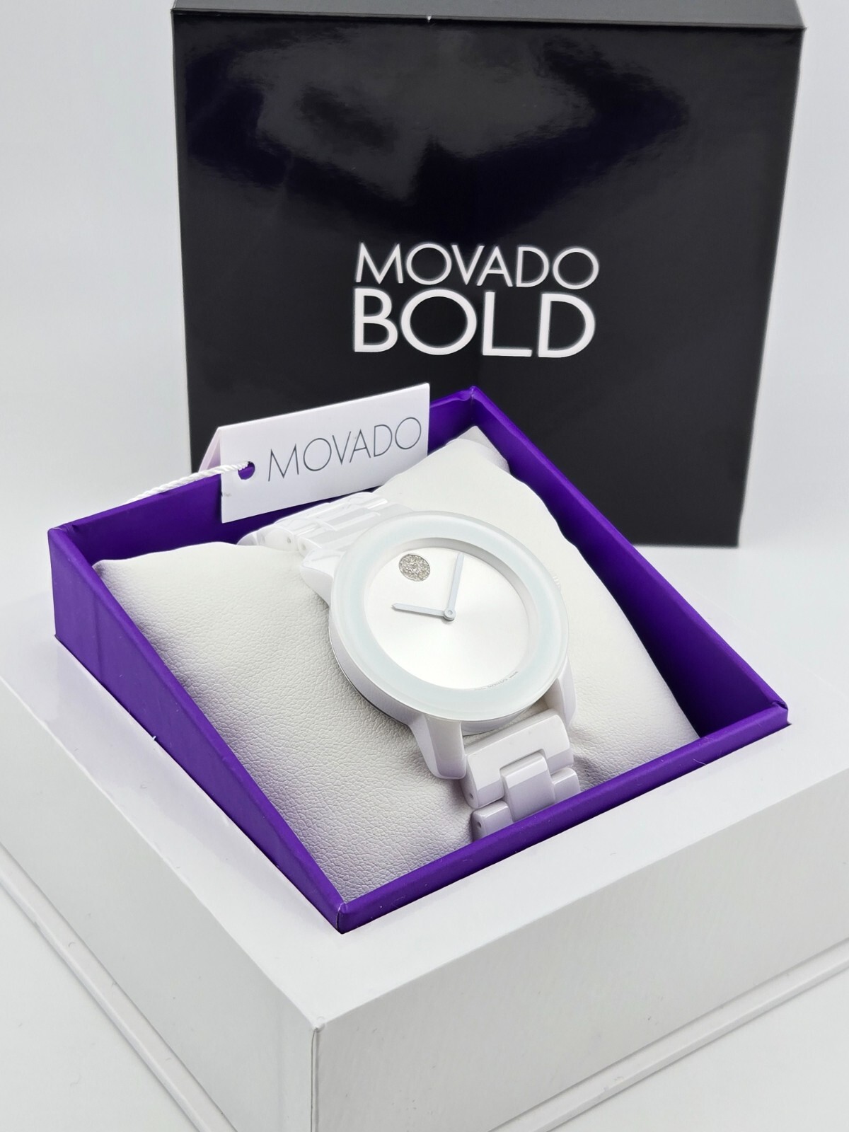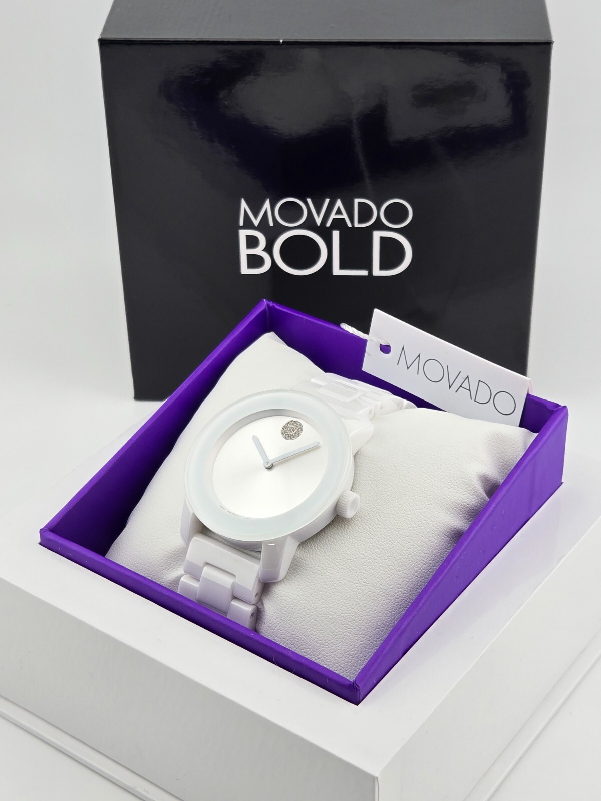 $895 MSRP | Movado Bold Women's Silver Museum Dial Ceramic Watch - 3600802 The Movado Bold Silver Museum Dial Stainless Steel Watch (Model 3600802) effortlessly combines modern design with timeless elegance. Featuring a sleek white stainless steel and ceramic case, this watch exudes sophistication and style. The fixed white ceramic bezel enhances its minimalist aesthetic, while the iconic silver and white Museum dial is both striking and functional. At the center of the dial, the signature Movado dot at 12 o'clock serves as a subtle nod to the brand's rich legacy. Designed for those who appreciate refined simplicity, this watch offers a perfect balance of fashion and function. Powered by a reliable quartz movement, this timepiece is designed to offer precise timekeeping with an analog dial type displaying the hour and minute hands. The durable scratch-resistant K1 crystal ensures clarity, while the pull/push crown provides easy adjustments. With a round 36mm case size, it sits comfortably on the wrist, making it suitable for both casual and formal occasions. The solid case back ensures durability, and the deployment clasp secures the watch firmly in place. Water-resistant up to 30 meters (100 feet), the Movado Bold Silver Museum Dial Watch is not only stylish but also practical for everyday wear. Whether you're at the office, out with friends, or enjoying a night out, this watch complements any attire with ease. With its refined design, reliable movement, and versatile features, the Movado Bold is a standout piece that adds sophistication to any collection. Features White stainless steel and ceramic case and bracelet. Fixed white ceramic bezel. Silver and white museum dial with white hands. Movado dot appears at the 12 o'clock position. Dial Type: Analog. Quartz movement. Scratch resistant K1 crystal. Pull / push crown. Solid case back. Round case shape, case size: 36 mm. Deployment clasp. Water resistant at 30 meters / 100 feet. Functions: hour, minute. Fast and Free Shipping You're already purchasing the item. Why pay additional for shipping, especially slow shipping? We get your order shipped out within 1-business day and delivered to your doorstep as quickly as possible. Competitive Pricing With our dynamic pricing model, our prices are always competitive. Our prices are some of the lowest that you will find on the internet. Rest assured that you're getting a good deal when purchasing with us. 30-day Money Back Guarantee We are committed to making sure that you leave this transaction satisfied. If you're unhappy with the product for any reason, you may return it back for your money-back or a replacement within 30 days. No questions asked!