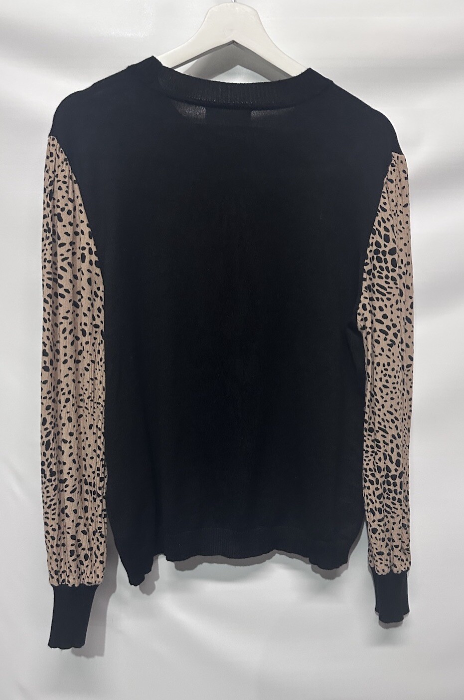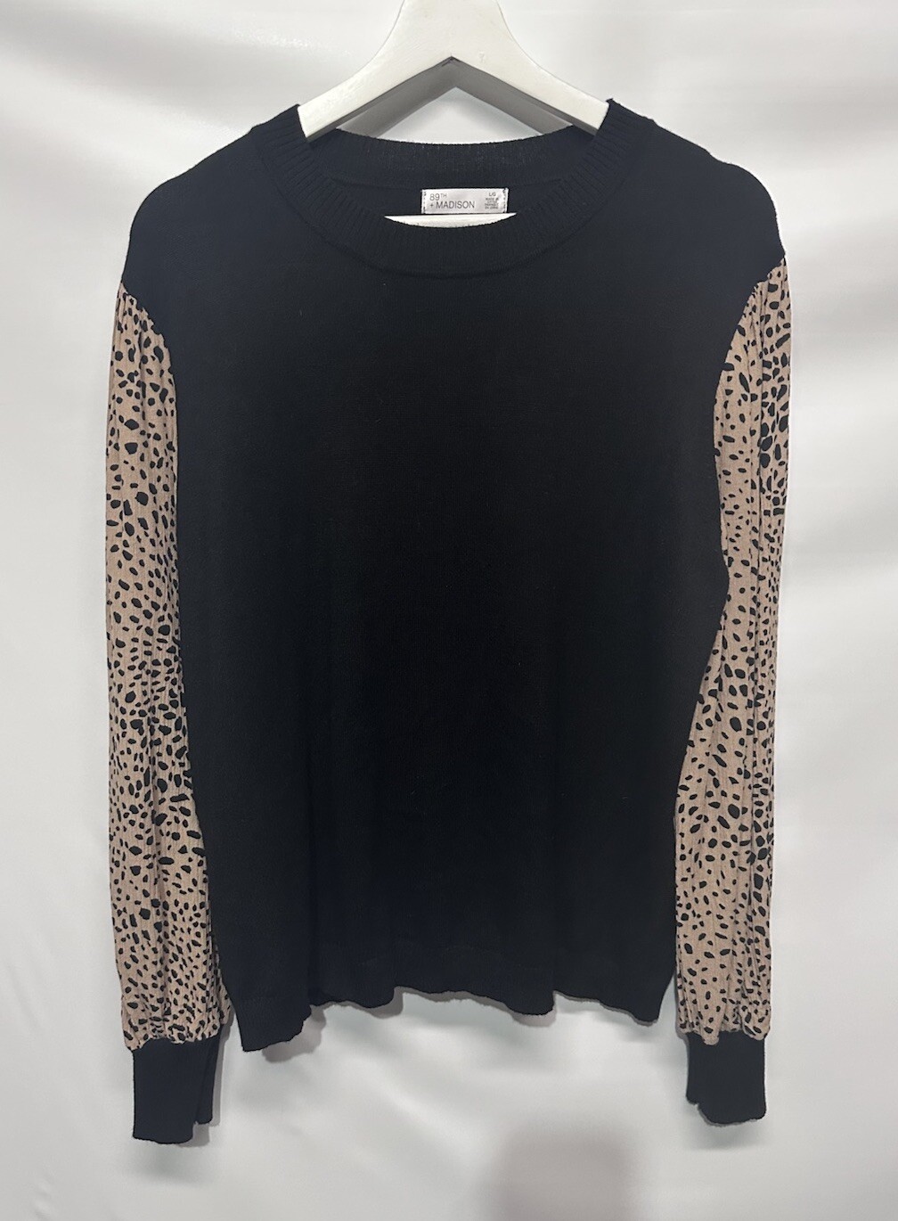 MEASUREMENTS length-23.5” bust-23” Elevate your wardrobe with this stylish and versatile sweater top from 89th & Madison. Featuring a classic crew neck and long balloon sleeves, this sweater is perfect for any occasion, whether it be a casual day out or a business meeting. The tight-knit polyester and rayon material makes it lightweight and easy to care for with machine washable instructions. The black and tan color scheme adds a touch of city and classic vibe to your outfit, while the regular fit ensures comfort and flattery. With its size L and regular size type, this sweater is perfect for any women's department. Whether you're traveling or enjoying the winter, summer, or fall season, this sweater is a must-have addition to your wardrobe.