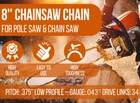 8 Inch Chainsaw Chain Fits Dewalt Pole Saw Chain, Dewalt DCCS623B, DCPS620B This chain replaces the following OEMs; Oregon R34, 90PX034E, Dewalt DWO1DT608; Black+Decker RC800, 90616714, 623382-00; Troy-Bilt 753-05592, Craftsman CMZCSC8; Poulan 581562501, 952051549; Husqvarna H38-34; Remington 8SC, 913-04094, 753-05592 Chain Specs: Semi-Chisel; Chain Type: 90PX; Pitch: 3/8'' Low Profile Gauge: .043''; Drive Links: 34; Bar Length: 8'' This Chain is compatible with the following Pole Saw Models: Dewalt DCPS620, DCPS620B, DCPS620M1; Black+Decker LPP120, NPP2018; Troy-Bilt PS720R, TBPS-8 DL; Husqvarna 128PS; Craftsman CMCCSP20M1, CMCCSP20, CMCCSP20B, 3585; This Chain is compatible with Pole Saw Models: Oregon PS250, PS250-E6, PS250-A6; Worx WG310; Remington RM0815P, RM0818BPS, RM2599, 108526-01; Poulan PP446T, PP445, PP446, PP258TP, PP258TPC, PP338PT, PP5000P, PR25PS, PR28PS, PP28PD, PP5000P, PPB5500P This Chain is compatible with Chainsaw Models: Dewalt DCCS623B, DCCS623L1; Black+Decker CCS818; Remington RM08181B, 104316-04, 104316-05 Please Verify Fitment and Drive Link Count Before Purchasing. Molten chains are made with OEM Quality with aftermarket prices! MoltenSales Chainsaw Chains are SO HOT they will melt through all your cutting needs. Shipping We offer FREE shipping on all orders! We ship within Three business days of payment, usually sooner. We use a selection of shipping services such as UPS, FedEx, USPS etc. We only ship to the lower 48 states, no APO/FPO addresses or PO Boxes allowed. Local pickups and combined shipping options are not provided at this time. Return You can return a product for up to 30 days from the date you purchased it. Any product you return must be in the same condition you received it and in the original packaging. Please keep the receipt. Payment We accept payment by any of the following methods: PayPal Please pay as soon as possible after winning an auction, as that will allow us to post your item to you sooner! Feedback Customer satisfaction is very important to us. If you have any problem with your order, please contact us and we will do our best to make you satisfied. Contact Us If you have any queries, please contact us via ebay. We usually respond within 24 hours on weekdays. Please visit our eBay store to check out other items for sale! Thank you for shopping at our store.