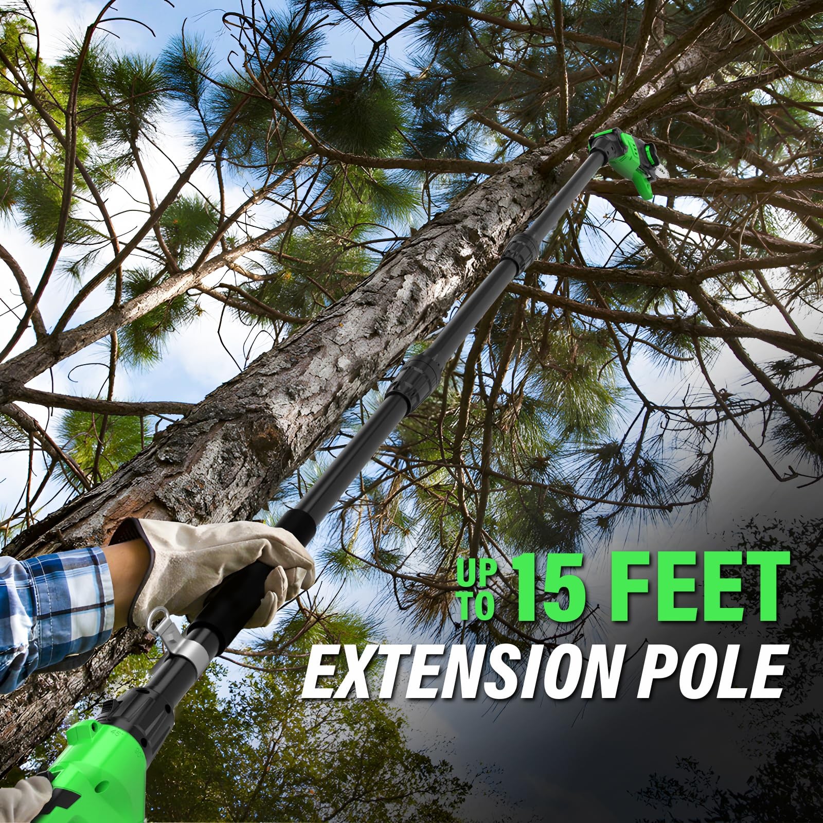 Cordless Pole Saw 8-Inch, 2-in-1 Pole Hedge Trimmer 18-Inch, 15-Foot Max Reach Pole Saw for Tree Trimming, 16ft/s Speed, Auto Oiling, Multi-Angle Pole Chainsaw with 2.0Ah Battery & Charger 2-IN-1 POLE SAW & HEDGE TRIMMER - The newly designed 2-in-1 pole saw with saw head attachment and hedge trimmer attachment is able to fully satisfy all your branch pruning needs. For the convenience of customers, we added a section of the extension tube, which is convenient for customers to prune tree branches. It does not depend on unstable ladders, making the work of pruning branches easy. UP TO 15 FEET EXTENDED HEIGHT - When you encounter hard-to-reach branches but don't want to risk climbing a ladder for safety reasons, you deserve to have this cordless pole saw. With an extension pole from 9.4 feet to 10.4 feet, you can reach heights of up to 15 feet (based on a 5.4-foot person holding the pole in an extended position at shoulder level). And there are 3 adjustable angles that allow you to easily trim branches in different locations. AUTOMATIC OILING & TOOL-FREE TENSIONING - pole saw is equipped with automatic oiling system to keep the chain running perfectly at 16FT/S, which greatly extends the service life of the high branch saw. Meanwhile, equipped with tool-free tensioning chain system, you can adjust the chain loosely and freely. Therefore, every time you use it, it can help you cut more efficiently and faster. SAFETY PROTECTION DESIGN - This pole saw incorporates a safety protection system that can only be activated when the safety lock and trigger are pressed, thus preventing the operator from accidental injury. Meanwhile, the new battery pack is equipped with an advanced battery management system, which can make the use safer. PACKAGING & WARRANTY - guarantees 12-month product warranty. If you have any problems with the product, please feel free to contact us. What you get:1 x cordless pole saPw, 1 x hedge trimmer attachment, 1 x 20v 2.0Ah battery pack, 1 x fast charger, 1 x shoulder strap, 1 x extension tube, 1 x manual.