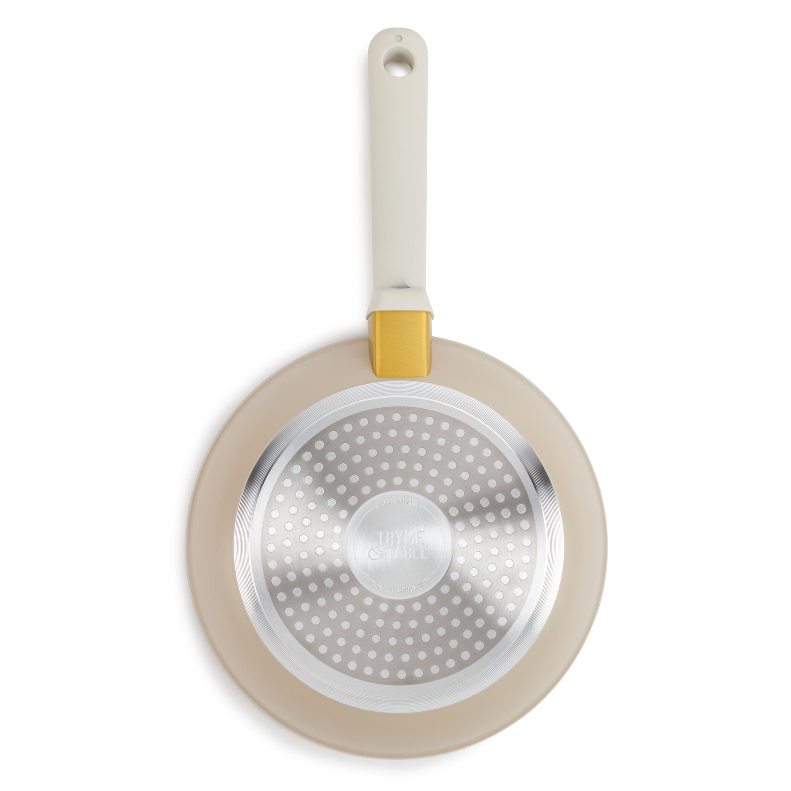 Meet the Nonstick 8-Inch Fry Pan in Taupe from our Essential line, designed for quality and affordability. Whether you're expanding yourcollection or starting fresh, this pan delivers great value without compromising performance. The nonstick surface ensures easy food release and quick cleanup, while its durable construction provides even heat distribution. Durability: The Nonstick 8-Inch Fry Pan is a versatile and essential frying pan that is built to last with premium aluminum and stainless steel, ensuring durability and reliability. Non-Stick Coating: Non-Stick Coating makes for effortless food release and quick cleanup, ideal for busy cooks who value convenience. Size and Versatility: This perfect 8-inch diameter fry pan is suitable for all cooktops, ensuring a seamless cooking experience whether you're using gas, electric, or induction stovetops. Heat Distribution: Experience even heat distribution with the induction base, allowing you to spend less time worrying about uneven cooking and more time enjoying your culinary creations. Essential for your Kitchen: The Nonstick 8-Inch Fry Pan, Taupe is the perfect versatile pan that elevates your kitchen's aesthetics while providing you an essential tool for everyday cooking, empowering you to become a chef within the walls of your own home. Cleaning Care: Dishwasher Safe 8" Fry Pan Non-Stick - Taupe & Gold