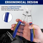 All-in-One Tool: Versatile wire stripper for both insulated and non-insulated terminals. Performs multiple functions including wire stripping, looping, crimping, cutting, splitting, and clamping Stripping Capacity: Efficiently strips and crimps wires ranging from 10-22 AWG, making it suitable for a wide variety of tasks High-Quality Construction: This 8-inch wire stripper is made from high-grade stainless steel, ensuring durability and rust resistance. It undergoes overall heat treatment, achieving an HRC hardness of 56-58 for enhanced strength Ergonomic Design: Features a curved, non-slip handle for a comfortable and secure grip, reducing hand fatigue during extended use Wide Range of Applications: Ideal for industrial, electrician, and household projects. Suitable for handling copper, aluminum, sheathed core wires, cables, multiple sheathed wires, and bare terminals Product Description Wire Crimping Tools & Pliers Wire Stripper WORKPRO CUTTER 8" Length 8" Stainless Steel Material Stainless Steel Ergonomic Grip Stripper Cutter Crimper 8" Length 9.5" Stainless Steel Material 55-65 HRC steel Ergonomic Grip Stripper Cutter Crimper Wire Stripper Wire Crimper
