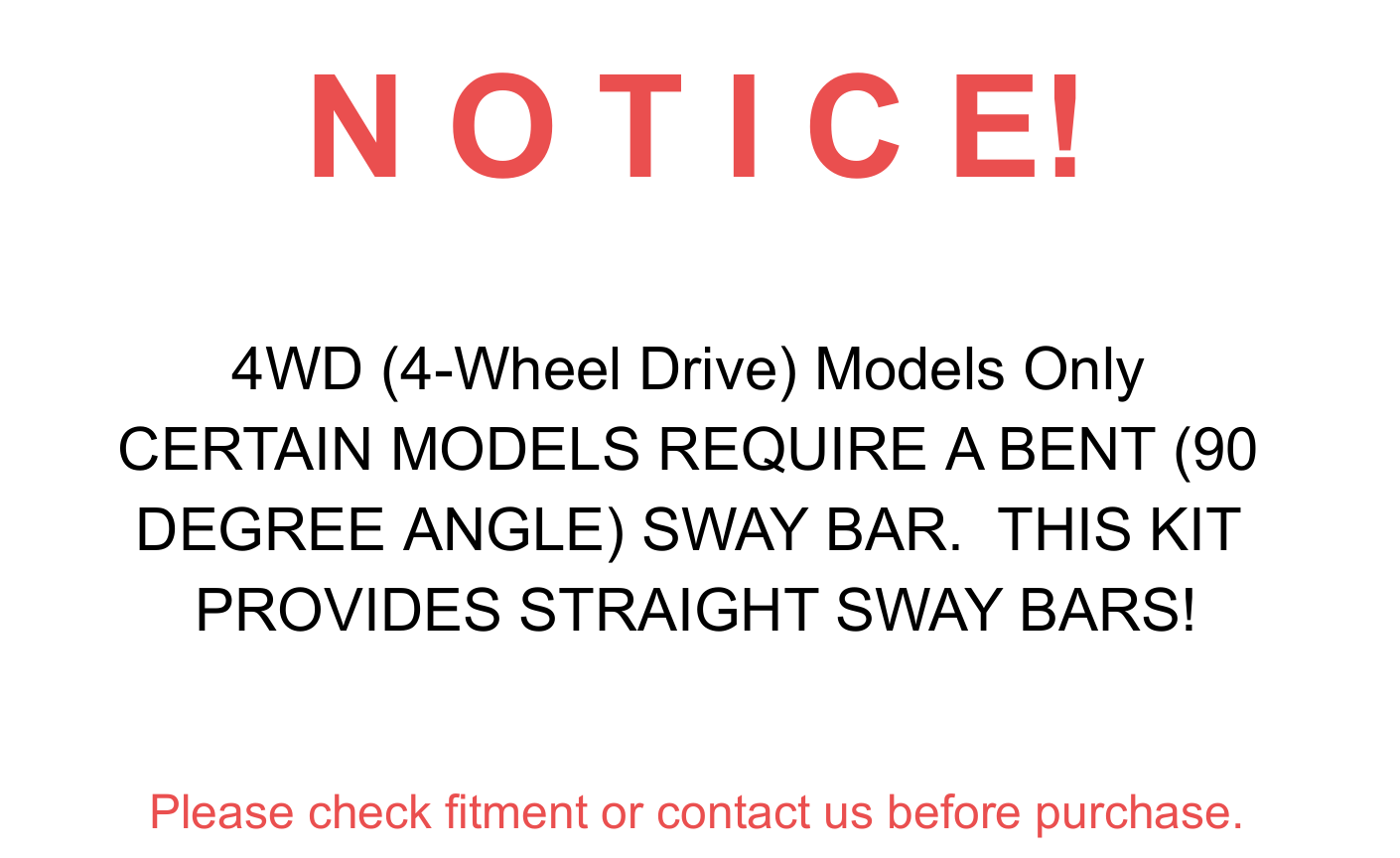 Store Categories Store Categories Hub Bearings Air Filter Suspension Parts Door handle-Interior Door handle-Exterior Window Switch Accessory Brake rotor and pads Brake Pads Brake rotor Brake Shoes ABS, Wheel Speed Sensor AC Compressor ATV Bearing Battery Charger Bolt Belt Locking Hub Car Gauge Carburetor Catalytic Converter Center Support Bearing Door Handle Cover Fuel Door Cover Oxygen Sensor Towing Strap Water Pump Wheel nut Wheel Bearings Trailer Parts Other Details 8pc Front Suspension Kit Kit Includes 1x Front Upper Control Arm w/Ball Joints Assembly - Driver Side - K80306 1x Front Upper Control Arm w/Ball Joints Assembly - Passenger Side - K80308 2x Front Lower Ball Joint Assembly Set - K80149 2x Outer Tie Rod End - Driver and Passenger Side - ES3691 2x Front Sway Bar End Link - Driver and Passenger Side - K80338 [STRAIGHT SHAPED SWAY BAR LINKS] **4WD (4-Wheel Drive) Models Only** **IMPORTANT NOTICE** CERTAIN MODELS REQUIRE A BENT (90 DEGREE ANGLE) SWAY BAR. THIS KIT PROVIDES STRAIGHT SWAY BARS! PLEASE CHECK YOUR VEHICLE BEFORE PURCHASING! FITS MAKE MODEL YEAR RANGE SPECIFIC DETAILS FORD F-150 2005 - 2008 4WD; Manufactured AFTER 11/30/04 w/ Straight Shaped Sway Bars *CHECK VEHICLE* LINCOLN MARK LT 2006 - 2008 4WD; w/ Straight Shaped Sway Bars *CHECK VEHICLE* Shipping and Return Items are usually shipped out within 24 hours during the business days after payment has been received. (except Saturday and Sunday).Delivery Time is about 4-7 business days to most of regions. We are not responsible for any wrong or undeliverable addresses. Please verify and update your shipping address on eBay during checkout. • All returned products (Replacements or Refund) need to be assigned an RMA # (Return Merchandise Authorization #) prior to return. Please contact us through eBay's messaging system to obtain an RMA# for the return. Any returned product without an RMA # on package will not be accepted or processed. Warranty • All of our brand new items come with a 30-60 Days money-back guarantee. We define the item as defective only if it doesn't function as described. • It is the buyer's responsibility to understand the item description before bidding. We will replace the defective items, provided that they are in stock within the warranty period posted with the listing. We will refund the purchase price if the replacement is not available or buyer prefers a refund and send the original item back at his/her own cost. • The guarantee will be only for the cost of the item, we will not responsible for installation or other fees like labor expenses, towing expenses, additional repair expenses or other related expenses. Payment Method • PayPal Preferred, Credit or debit card through PayPal. Terms of sales Anyway, if you have any troubles,please feel free to contact us.We're willing to do anything resonable to help you out.Please do not leave any negative or neutral feedback before letting us know. thank you for your cooperate !! About us We are a leading company in the range of automotive parts, Battery products, Hub bearing, Suspension parts, Door Handle, Window Switch. We are an America company, Our Products are manufactured in TS16949 or ISO9001 certified facilities. We enjoy providing the highest quality, lowest price, best service on the market. We hope we can give you amazing shopping experience in our online store.