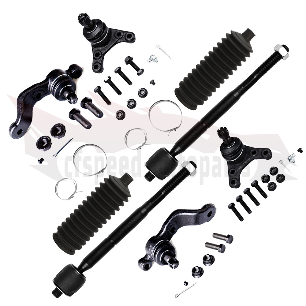 1.Fit For 1995 - 2004 Toyota TACOMA Models With Power Steering Excluding Pre Runner 2.Package Includes: 1x Part# Front Lower Ball Joint - Driver Side-K90260 1x Part# Front Lower Ball Joint - Passenger Side-K90261 2x Part# Front Inner Tie Rod End-EV409 1x Part# Front Upper Ball Joint - Driver Side-K90256 1x Part# Front Upper Ball Joint - Passenger Side-K90257 2x Part# Rack and Pinion Bellow-103-3089 3.Notes Cfspeed-autoparts 8PCS Front Lower Upper Ball Joints Inner Tie Rod End For 1995-2004 Toyota Tacoma 1.Fit For 1995 - 2004 Toyota TACOMA Models With Power Steering Excluding Pre Runner 2.Package Includes: 1x Part# Front Lower Ball Joint - Driver Side-K90260 1x Part# Front Lower Ball Joint - Passenger Side-K90261 2x Part# Front Inner Tie Rod End-EV409 1x Part# Front Upper Ball Joint - Driver Side-K90256 1x Part# Front Upper Ball Joint - Passenger Side-K90257 2x Part# Rack and Pinion Bellow-103-3089 3.Notes (1).Please check the fitment chart above before payment making sure all the suspension parts listed on this page are compatible with your automobile. (2).Please refer to Moog official website before narrowing down your search so as to avoid unnecessary item not as described return requests. (3).Please contact our customer services for targeted discount after all the items are received if you have reached any targeted discount thresholds, the terms of which is at the bottom of this page. Ball Joint Replacement Guideline: If there is a knocking or clunking noise in the area of the front axle when the car is traveling over road bumps, potholes or curbs, then there is usually a defect in a component of the wheel suspension. Picture(A) The side of the front axle from which the (vibration) noise is emanating can already be determined during a test drive. The type of noise also already provides certain indications for maintenance regarding which components might be faulty. Picture(B) 1.Raise the vehicle and remove the front wheels. 2.To loosen the fastening screws and fixing nuts of the compression ball joint more easily, spray them with rust remover and allow to act for a few minutes. Picture(C) 3.Loosen the fastening screws of the broken ball joint on the control arm and remove the nuts. Picture(D) 4.Loosen and remove the fixing nut of the ball joint on the steering knuckle. Tip:If the ball stud rotates, hold the ball stud in place with a hexagon socket. Picture(E) 5.Remove the bad or worn ball joint from the control arm. 6.Loosen the compression ball joint on the steering knuckle using a suitable special tool. Picture(F) 7.Clean the cone connection. Tip:For better sealing and durability of the ball joint sleeve, a little silicone grease can be applied to the contact surface. Picture(G) 8.Insert new compression ball joint in the control arm and steering knuckle and tighten with new fixing nuts. 9.Reinstall front wheels. Lower the vehicle and tighten the wheel studs to the tightening torque specified by the vehicle manufacturer. 10.Measure the chassis and adjust it using the various holes on the compression ball joint if necessary. 11.Finally, carry out a test drive. Sway Bar Stabilizer Link Replacement Guideline: While driving, the following signs may indicate a faulty sway bar stabilizer link: (1).Rattling and thumping noises on rough roads. (2).Imprecise vehicle handling. (3).Stronger inclination of the vehicle during cornering. If the sway bar stabilizer link is found to be defective, it should be replaced as described below. Picture(A) 1.Raise vehicle and remove front wheels. Tip:Always check both stabilizer links and replace them in pairs if necessary. 2.Spray fastening nuts of the stabilizer link with rust remover and let act for a few minutes. Picture(B) 3.Loosen the lower fastening nut of the stabilizer link at the stabilizer and remove. Tip:If the ball stud also starts to turn, hold it with a suitable tool. 4.Press stabilizer link out of torsion bar. Picture(C) 5.Loosen the upper fastening nut of the stabilizer link at the suspension strut and remove it. Tip:If the ball stud also starts to turn, hold it with a suitable tool. Picture(D) 6.Press stabilizer link at suspension strut out of bracket. Picture(E) 7.Insert new stabilizer link at suspension strut. Picture(F) 8.Tighten stabilizer link at suspension strut to the tightening torque specified by the vehicle manufacturer. Tip:Secure the ball stud against twisting with a suitable tool. Picture(G) 9.Insert new stabilizer link at stabilizer. 10.Tighten stabilizer link at stabilizer to the tightening torque specified by the vehicle manufacturer. Tip:Secure the ball stud against twisting with a suitable tool. Picture(H) 11.Remount the front wheels. Lower the vehicle and tighten the wheel studs to the tightening torque specified by the vehicle manufacturer. Tip:Even if replacing the stabilizer link does not directly affect the chassis setting, we recommend checking the axle setting and adjusting if necessary after working on the suspension. 12.Conclude with a test drive. Tie-Rod End Replacement Guideline: If you feel a bump in the steering when driving over road bumps or curbs, this might be due to worn tie rod ends or inner tie rods. Clicking noises during sudden steering movements can also be symptoms of a defective tie rod. In order to determine the exact cause and replace the defective tie rod, the car must be elevated with a vehicle lift in order to be examined more closely. This useful tip applies to the exchange of tie rod ends and inner tie rods, which together form the so-called tie rod. Picture(A) Note: Cleanliness is extremely important when working on the power steering. Incorrect work and contamination can lead to leakage and, in the worst case, to failure of the steering assistance. 1.Lift the vehicle and dismount the front axle wheels. 2.Spray the fastening nut of the tie rod end with rust remover and leave it on for a few minutes. Picture(B) 3.Dismount the front underride guard. Picture(C) 4.Loosen the fastening nut from 
