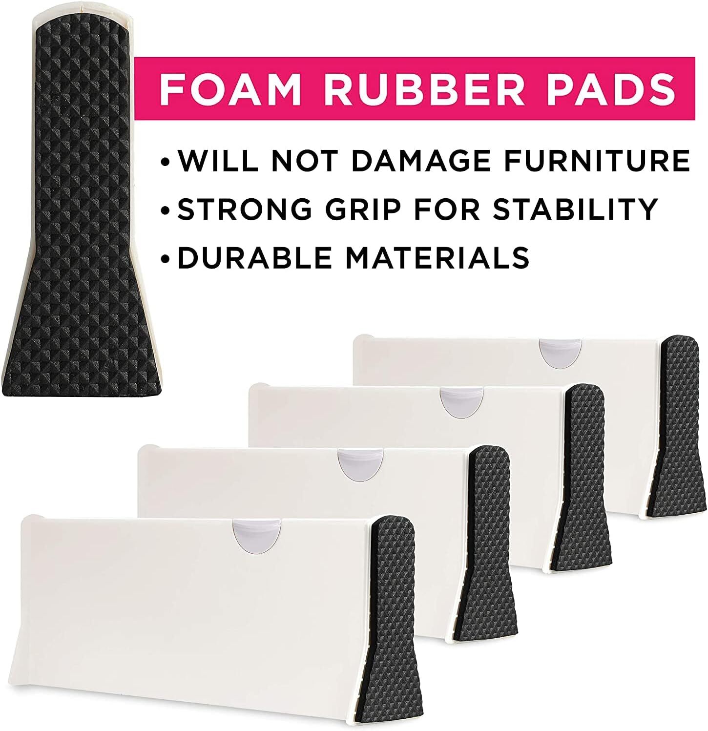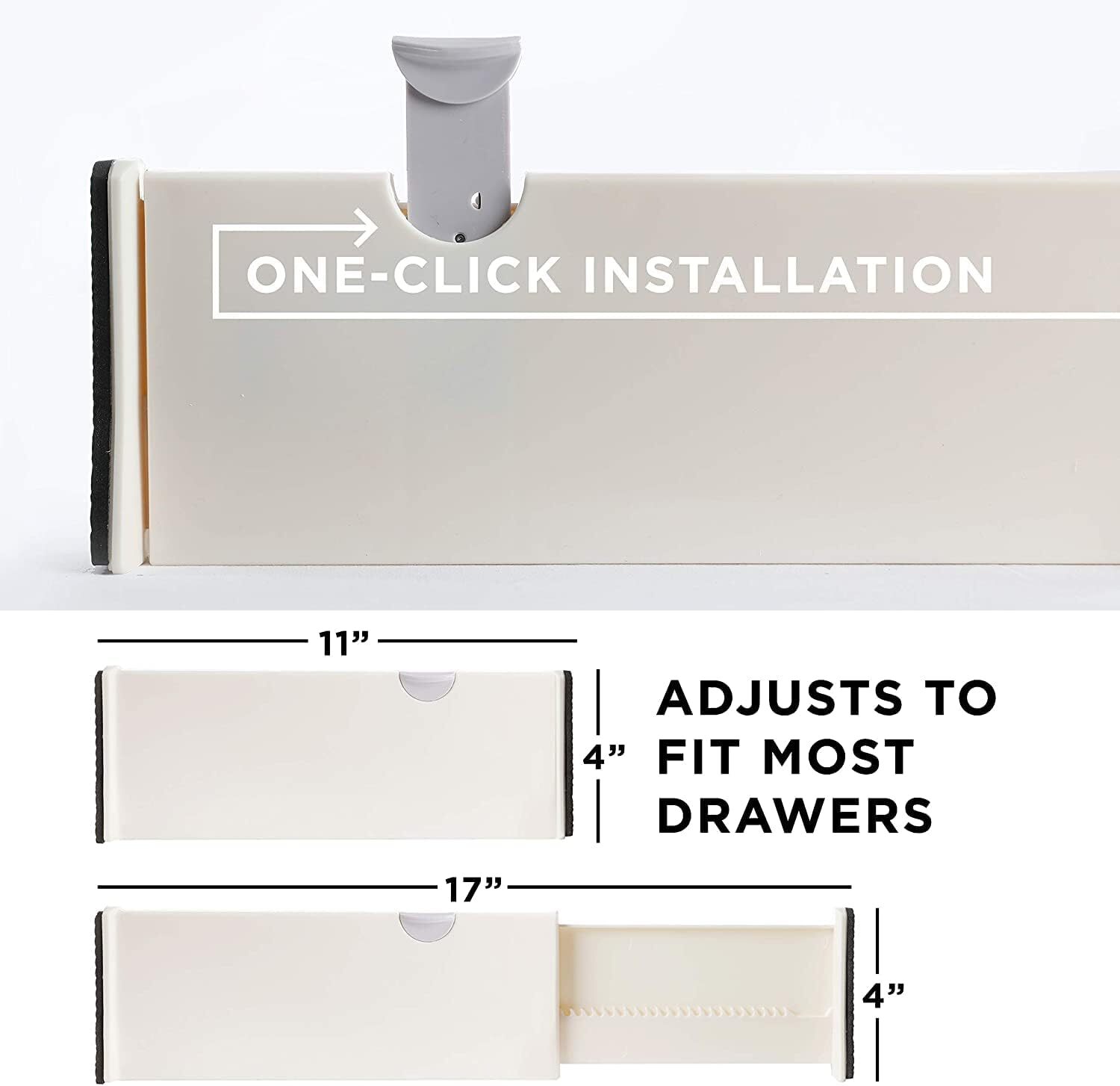 8 Drawer Organizer and 4" Tall, 11"-17" Long, 8 Pack, White Product Details Specific Uses For Product: Bathroom, Utensils, Socks, Clothes, Home Kitchen, Bedroom, Cosmetics, Underwear, Clothing Material: Rubber Special Feature: Expandable Color: White Brand: Berry Ave Finish Type: Polished Product Dimensions: 4"D x 11"W x 1"H Shape: Rectangular Number of Items: 8 Maximum Weight Recommendation: 100 Pounds Item Weight: 220 pounds Manufacturer: Berry Ave Item model number: Kitchen Drawer Organization Tools Finish types: Polished Batteries required: No Mounting TypeItem Weight: Tension Mount100 Kilograms Number of CompartmentsUnit Count: 88 Count Adjustable slide and one-click installation with no tools or glues required; foam rubber pads grip strong without leaving any marks or residue A cutlery and utensil organization solution; safe separators for sharp knife section; insert in dressers to neatly present your sock and t shirt selection; designed to not snag or damage delicate clothing like your scarf Strong spring loaded mechanism will not weaken over time; built to stay standing and sturdy even in drawers with heavy spice containers Expandable design fits most drawers and cabinets front to back or side to side; 4 inches tall and adjustable from 11 to 17 inches