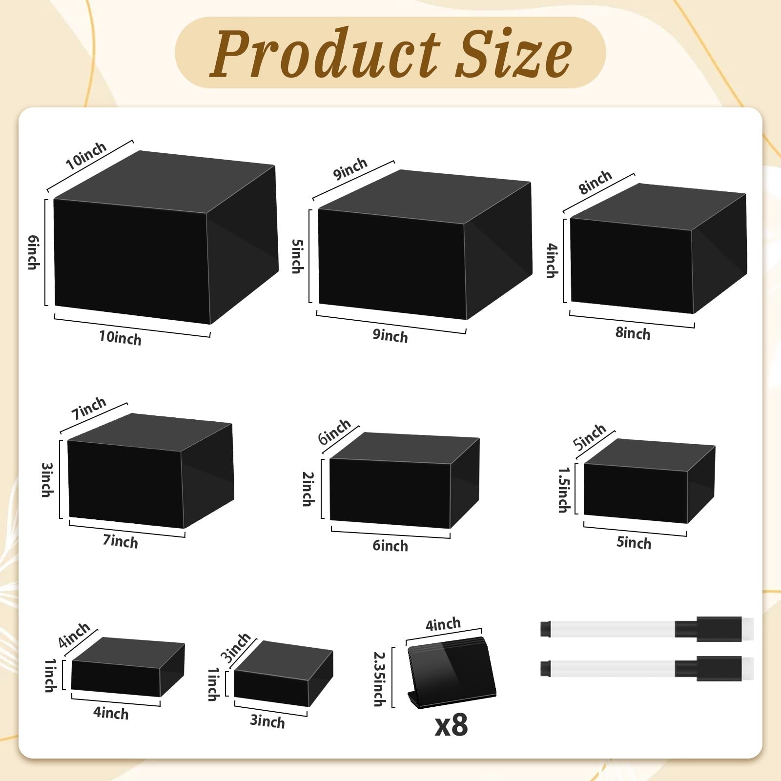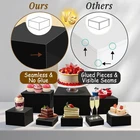 8Pcs Buffet Risers, Food Risers for Buffet Table, Acrylic Cube Boxes Display Stands with Hollow Bottoms, Dessert Collectibles Shelf Nesting Riser Set for Party Black (Size 3",4",5",6",7",8",9",10") Buffet table food display stands and risers are both beautiful and elegant, adding a touch of sophistication to any event. Crafted from high-quality acrylic with a hollow bottom design, these acrylic cube display risers are not only stackable but also versatile.They can serve as display platforms for food, desserts, and decorative items, while doubling as convenient storage boxes. Specification: Material: acrylic Color: black Package Includes: 8 x acrylic buffet risers(size 3",4",5",6",7",8",9",10") 8 x display cards 2 x whiteboard markers Acrylic cube display stands suitable for many places, you can put them in parties, weddings, art exhibitions, jewelry stores, dessert stores, and other different places to display your items. 8 Sizes Buffet Risers Set: You’ll get 8 black food risers for buffet table (size 3",4",5",6",7",8",9",10"), along with 8 display signboard and 2 white whiteboard markers. This versatile buffet table display and stands set is great for family events and gatherings, providing the ideal display solution for any occasion. Reliable Material: The food display risers are crafted from high-quality acrylic with a 3mm thickness, providing enhanced load-bearing capacity. Durable and reliable, these acrylic food risers for buffet table are designed to resist breakage. With smooth surfaces and edges, they are easy to clean and ideal for reuse. Food Display for Buffet Table: Acrylic cube boxes bring a touch of sophistication to your cupcake, candy, and dessert displays, elevating the visual appeal of your dishes. By adding height and dimension, these catering dessert cake stands enhance the overall presentation, making your food stand out beautifully. Keep your buffet table looking stylish and elegant, creating a memorable atmosphere for your guests. Nesting Design: These acrylic display risers feature a hollow bottom and can be arranged in various display styles. When not in use, the display stand shelf with hollow bottoms nest together neatly for compact, space-saving storage, making them an ideal choice for frequent events and gatherings. Writeable Display Signboard: Our acrylic dessert display stand is equipped with 2 whiteboard markers which can be used for writing. You can write the names of the desserts on the display signboard or the acrylic dessert display stand. The eraser on the whiteboard markers can be used to erase the writing marks. It is very convenient. Wide Applications: With a wide range of uses, these acrylic risers display stands aren’t just limited to food and desserts. These food display risers for dessert table also make excellent stands for collectibles, jewelry, figurines, perfumes, cosmetics, crafts, and more. Flip them over, and they transform into convenient storage containers, offering versatile solutions for all your needs.